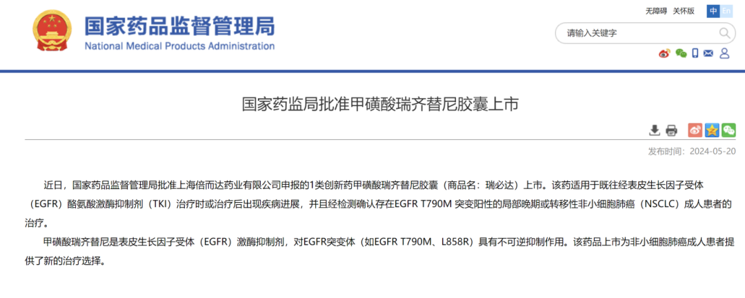 不知不觉,2024年赛程过半。近日,各省市纷纷发布高考查分时间。而在生命健康产业这个更大的“考场”上,张江药谷企业过去半年晒出了怎样的“成绩单”? 据不完全统计,截止到2024年5月底,今年,张江药谷获批上市2款1类新药和40款第三类医疗器械。这些产品在国内获批上市,为张江生命健康行业注入新动能。 截至目前今年获批上市的1类新药 企 业:科州药业 产 品:妥拉美替尼胶囊(商品名:科露平®) 获批时间:2024年3月 作用机制:选择性丝裂原活化蛋白激酶激酶1和2(MEK1/2)抑制剂 适 应 症:NRAS突变的晚期黑色素瘤 (图片来源:国家药品监督管理局) 企 业:倍而达药业 产 品:甲磺酸瑞齐替尼胶囊(商品名:瑞必达®) 获批时间:2024年5月 作用机制:表皮生长因子受体(EGFR)激酶抑制剂 适 应 症:局部晚期或转移性非小细胞肺癌 (图片来源:国家药品监督管理局) 此外,位于张江金山生物医药产业园的科济药业今年3月1日宣布,国家药品监督管理局(NMPA)已正式批准针对BCMA的自体CAR-T候选产品泽沃基奥仑赛注射液(商品名:赛恺泽®)的新药上市申请,用于治疗复发或难治性多发性骨髓瘤成人患者,既往经过至少3线治疗后进展(至少使用过一种蛋白酶体抑制剂及免疫调节剂)。 目前,全国已获批细胞与基因疗法注册性临床试验项目中,张江占上海超过一半、占全国近20%。泽沃基奥仑赛是国内上市的第五款CAR-T产品,同时也是国内第二款靶向BCMA的CAR-T产品。 对此,科济药业创始人、董事会主席、首席执行官、首席科学官李宗海博士表示:“赛恺泽®成功获批上市,是公司发展历程中的重要里程碑,也是对我们团队不懈努力的最好回馈。我们期待赛恺泽®能为复发或难治性多发性骨髓瘤成人患者带来更多的希望,改善他们的生存状况。” 截至目前今年获批上市的第三类医疗器械(部分) 企 业:安钛克医疗 产 品:可调弯鞘管 获批时间:2024年2月 适 应 症:可为适配的其它心脏消融导管提供经皮穿刺通过血管进入心腔的通路 企 业:霖晏医疗 产 品:Holonavi S脊柱外科手术导航系统 获批时间:2024年3月 适 应 症:可用于成人脊柱外科手术过程中手术器械和植入物的导航 Holonavi S脊柱外科手术导航系统由控制主机、光学追踪仪、导航工具和增强现实专用眼镜软件组成,可用于成人脊柱外科手术过程中手术器械和植入物的导航。值得一提的是,Holonavi S是国内首个将AR技术应用在临床上并成功获NMPA批准的脊柱外科手术导航系统。 企 业:逸思医疗 产 品:easyEndo®Powered电动腔镜吻合器(全称:一次性使用电动腔镜直线型切割吻合器及钉仓) 获批时间:2024年3月 适 应 症:可用于开放或腔镜下胃、肠等组织的切除、离断和吻合,肺、胰腺及肝脏等器官的切除、离断,胆管结构的离断以及(肝、肺、肾)血管的离断 企 业:神通医疗 产 品:Safecer™栓塞保护器 获批时间:2024年5月 适 应 症:用于在颈动脉支架成形术中为患者提供远端栓塞保护,可有效捕获和移除血栓等栓塞物质 企 业:蓝帆博元 产 品:一次性使用冠脉血管内冲击波导管——Soni Cracker™-CL 获批时间:2024年5月 适 应 症:用于成人患者支架植入手术前对原发性冠状动脉血管钙化病变(冠状动脉狭窄程度≥50%)进行预处理和球囊扩张 序号 公司 产品 1 上海微创旋律医疗科技有限公司 双腔微导管 2 上海佐心医疗科技有限公司 左心耳封堵器系统 3 上海西门子医疗器械有限公司 肺结节CT图像辅助检测软件 4 X射线摄影透视系统 5 移动式C形臂X射线机 6 北极沣生物科技(上海)有限公司 一次性使用冷冻探头 7 上海宏普医疗器械有限公司 腔静脉滤器 8 血管内回收装置 9 上海心玮医疗科技股份有限公司 微导管 10 上海鹏冠生物医药科技有限公司 可吸收骨蜡 11 神遁医疗科技(上海)有限公司 神经血管球囊导引导管 12 上海博畅医疗科技有限公司 微导管 13 上海新华瑞思医疗科技有限公司 复合疝修补补片 14 上海导向医疗系统有限公司 一次性冷冻消融针 15 上海申淇医疗科技有限公司 外周血栓抽吸导管 16 上海方润医疗科技股份有限公司 半月板缝合系统 17 上海声拓医疗科技有限公司 等离子手术系统 18 动之医学技术(上海)有限公司 藻酸盐敷料 19 上海微创电生理医疗科技股份有限公司 定位型可调弯导引鞘组 20 上海德尔格医疗器械有限公司 呼吸机 21 上海舒瑞康医疗科技发展有限公司 尿失禁悬吊带 22 疝修补补片 23 上海欣吉特生物科技有限公司 心外科生物补片 24 上海蓝帆博元医疗科技有限公司 冠状动脉球囊扩张导管 25 上海暖阳医疗器械有限公司 输送型球囊扩张导管 26 上海微创医疗器械(集团)有限公司 冠状动脉球囊扩张导管 27 上海蓝脉医疗科技有限公司 腔静脉滤器 28 上海微创生命科技有限公司 经外周静脉置入中心静脉导管 (数据来源:国家药品监督管理局医疗器械公告通告) 另外,2024年上半年也有7款来自张江的试剂盒获批上市,包括: 序号 公司 产品 1 上海芯超生物科技有限公司 幽门螺杆菌gyr A基因突变检测试剂盒(PCR-荧光探针法) 2 上海仁度生物科技股份有限公司 丙型肝炎病毒核酸测定试剂盒(RNA捕获探针法) 3 奥然生物科技(上海)有限公司 核酸扩增分析仪 4 上海速创诊断有限公司的 沙眼衣原体和淋球菌核酸检测试剂盒(恒温扩增芯片法) 5 解脲脲原体和人型支原体核酸检测试剂盒(恒温扩增芯片法) 6 上海鹍远健康科技有限公司 人Septin9、BCAT1、IKZF1、BCAN、VAV3