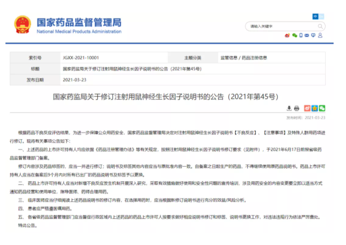 3月23日,国家药监局发布关于修订注射用鼠神经生长因子说明书的公告,决定对注射用鼠神经生长因子说明书【不良反应】、【注意事项】及特殊人群用药项进行修订。其中,【注意事项】中强调增加“应严格按照说明书规定的用法用量给药。严禁改变给药途径。”