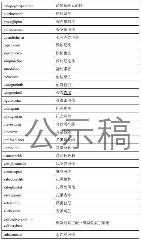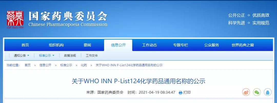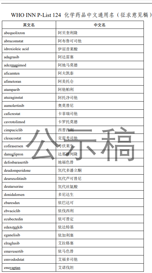 经第十一届药典委员会相关专业委员会审核,对世界卫生组织国际非专利名称(INN)建议目录124(P-List-124)中收录的化学药品中文通用名称予以确定。为确保上述通用名称的准确性、合理性和唯一性,现公示征求社会各界意见(详见附件)。公示期自发布之日起两周。请相关单位认真研核,若有异议,请及时来函提交反馈意见,并附相关说明和联系方式。相关单位来函需加盖公章,个人来函需本人签名,同时将电子版发送至指定邮箱。