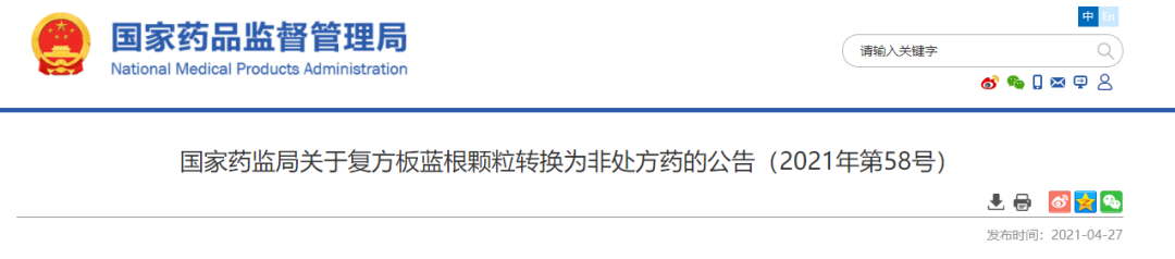 4月27日,国家药监局发布公告,复方板蓝根颗粒转换为非处方药。