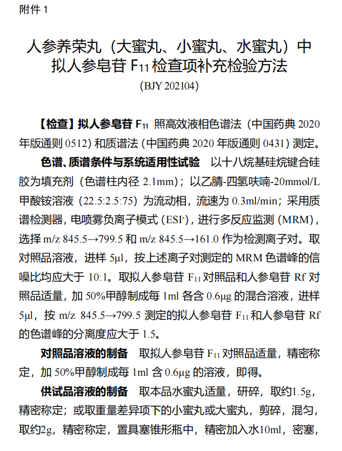 1.人参养荣丸(大蜜丸、小蜜丸、水蜜丸)中拟人参皂苷F11检查项补充检验方法