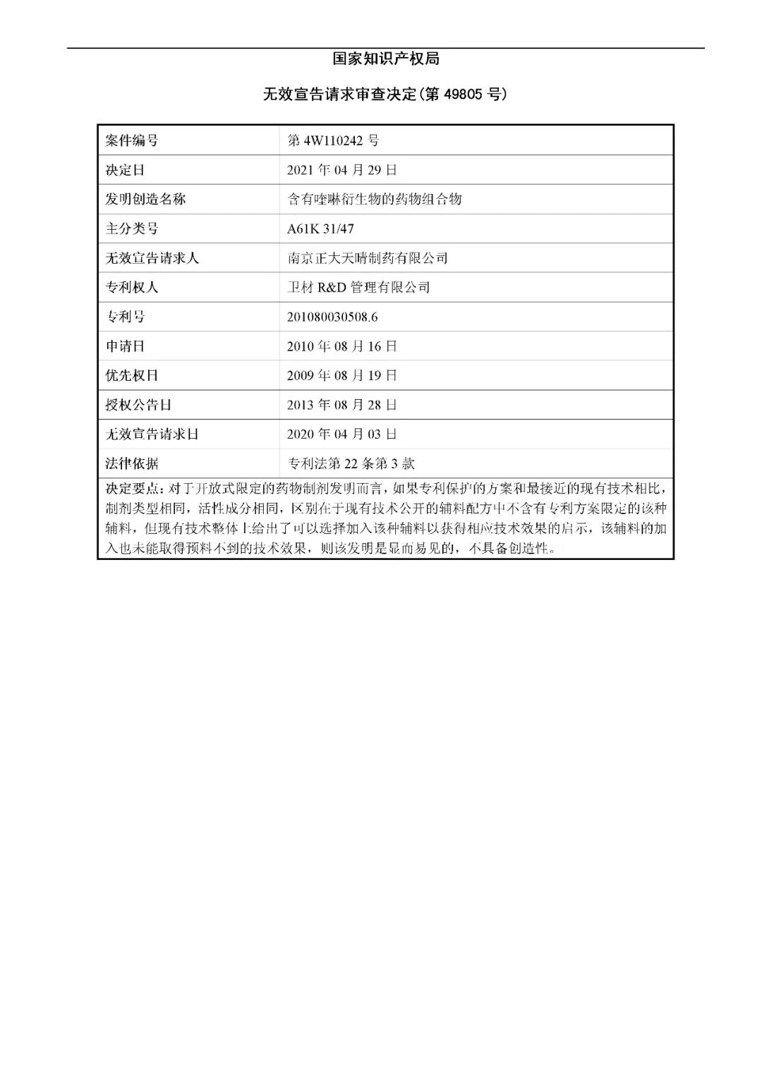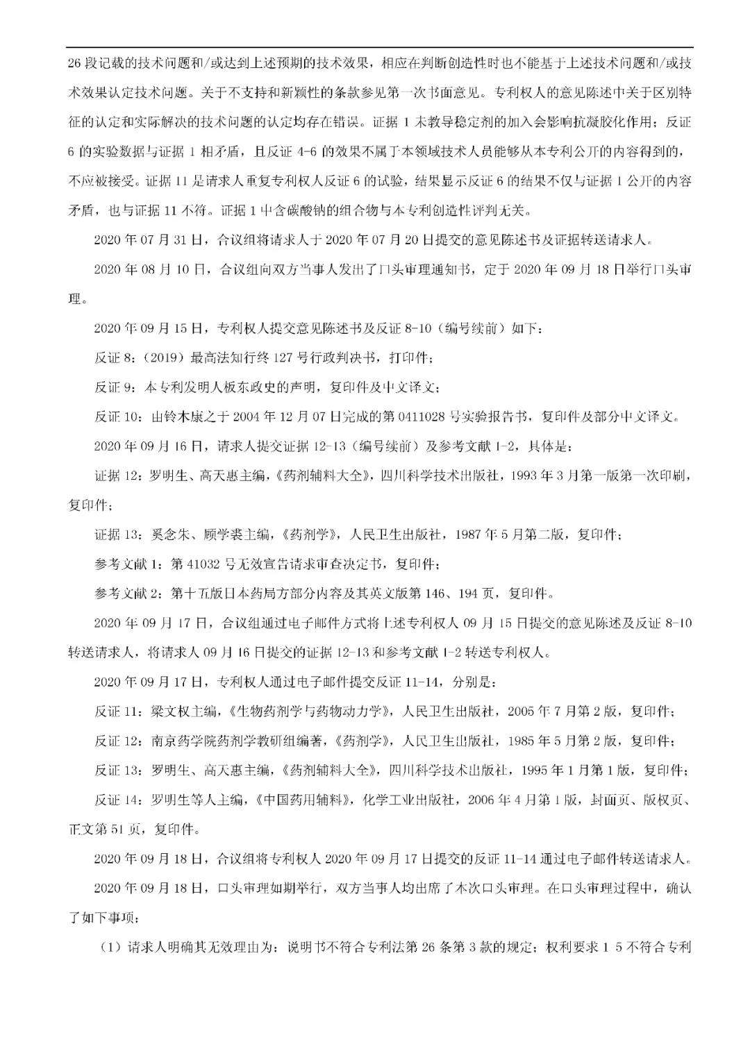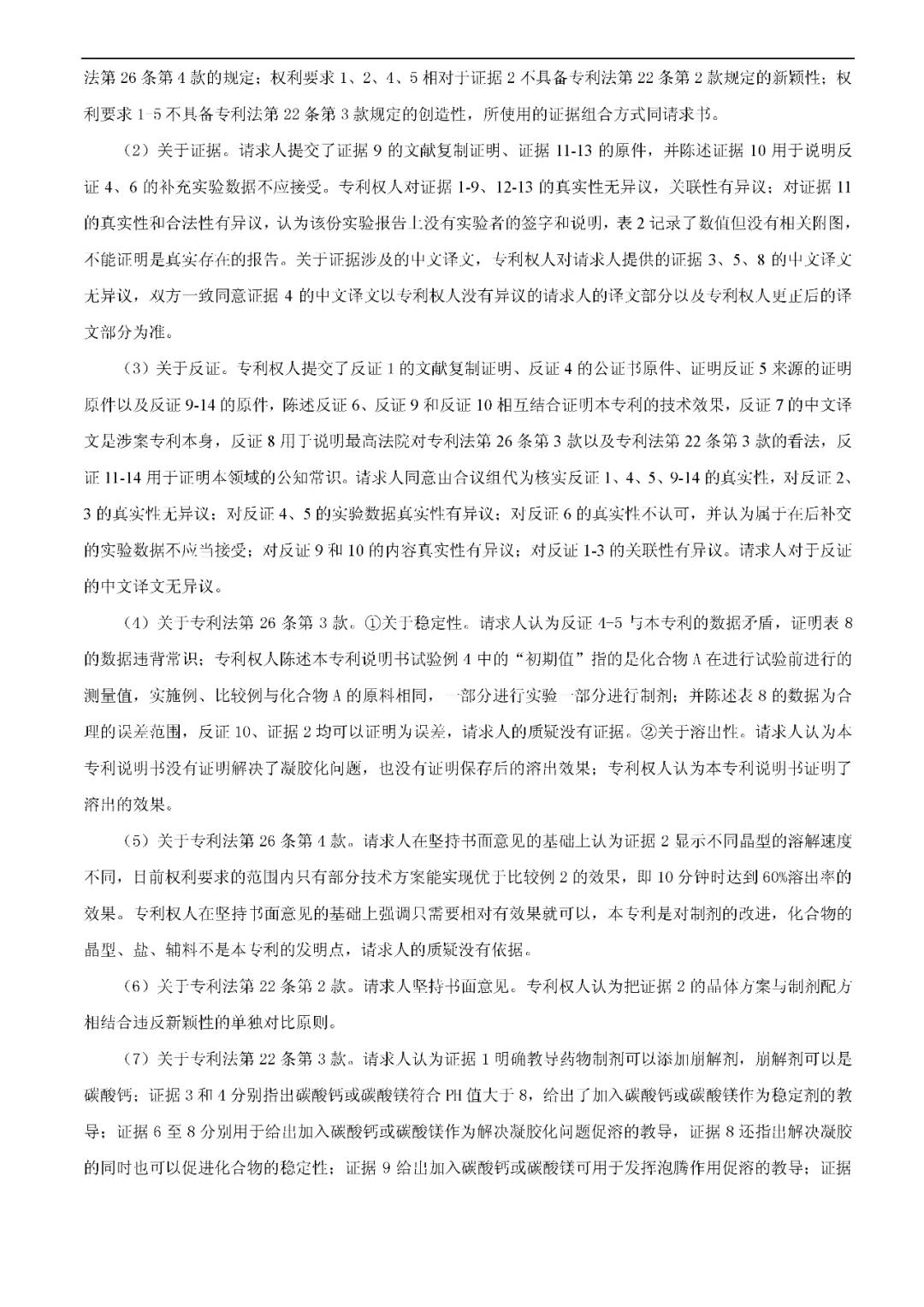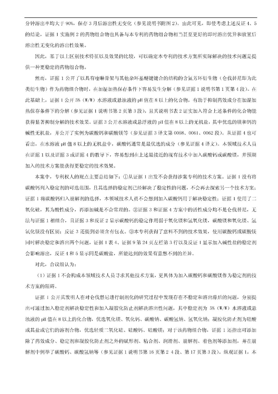 决定要点:对于开放式限定的药物制剂发明而言,如果专利保护的方案和最接近的现有技术相比,制剂类型相同,活性成分相同,区别在于现有的技术公开的辅料配方中不含有专利方案限定的该种辅料,但现有技术整体上给出了可以选择加入该种辅料以获得相应技术效果的启示,该辅料的加入也未能取得预料不到的技术效果,则该发明是显而易见的,不具备创造性。