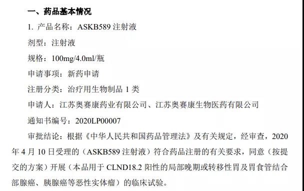 2020年7 月 8 日,奥赛康发布公告,其自主研发、具有自主知识产权的抗肿瘤生物新药「ASKB589 注射液」获批临床,拟用于 CLND18.2 阳性的局部晚期或转移性胃及胃食管结合部腺癌、胰腺癌等恶性实体瘤。目前该药在处于I/II期临床试验,相关临床登记号为CTR20202121、NCT04632108。