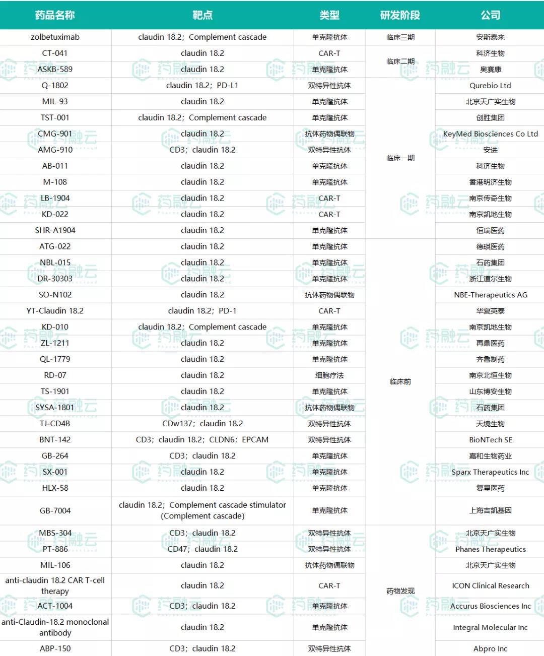目前为止,国内外超过20家药企布局了claudin 18.2靶向药物的开发,在单克隆抗体、双抗药物、CAR-T均有不错进展。