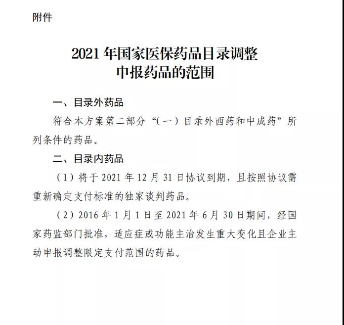 根据工作安排,现将《2021年国家医保药品目录调整工作方案》和《2021年国家医保药品目录调整申报指南》正式公布。自2021年7月1日起,在我局官方网站开通网上申报系统,请符合条件的申报主体予以关注。