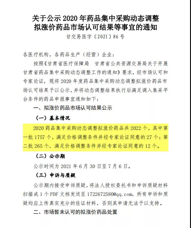 导读:近日,省医保局发布《甘肃省药品集中采购动态调整工作通知》,公示结果显示满足价格调整并经专家论证同意的有39个,其中第一批获批的有27个,第二批获批的有12个。价格最高上涨12倍!