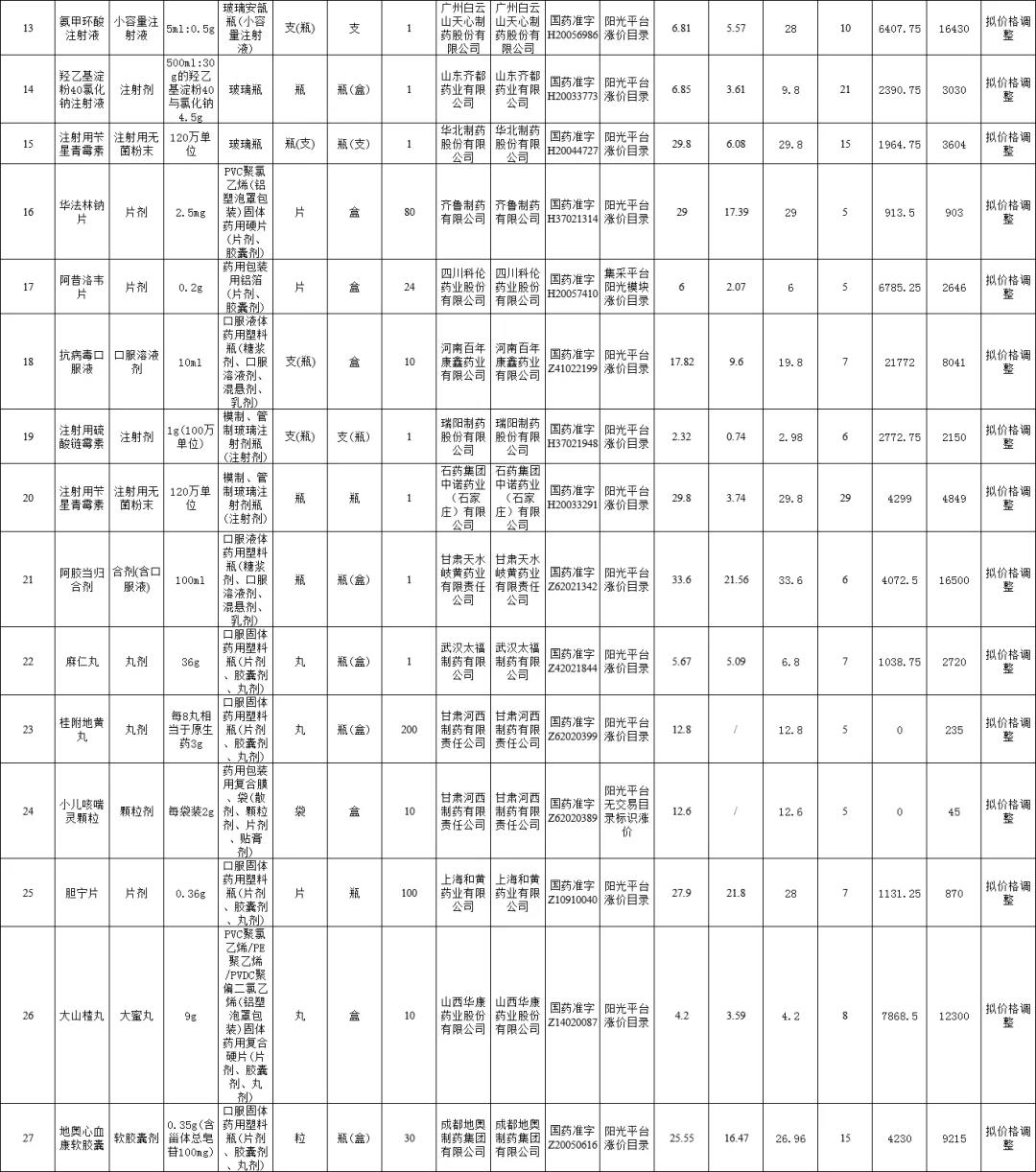 拟价格调整名单:27个
