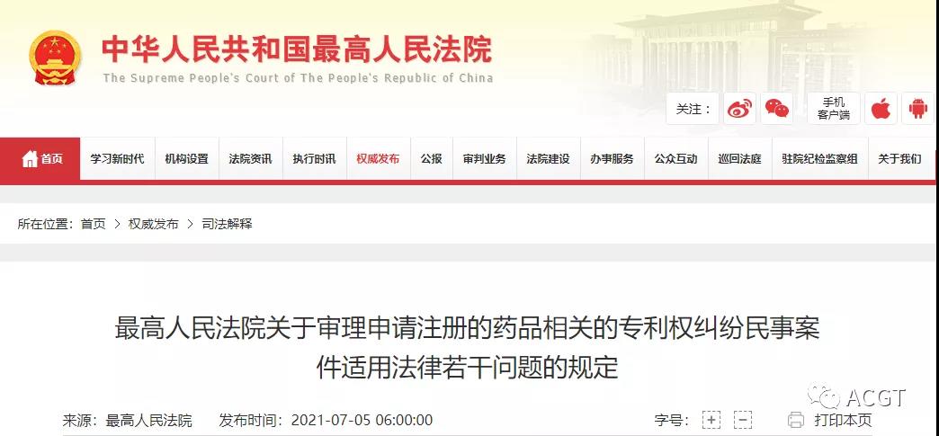 配套政策陆续出台,7月5日,最高人民法院关于审理申请注册的药品相关的专利权纠纷民事案件适用法律若干问题的规定。7月5日,施行,详细见下述: