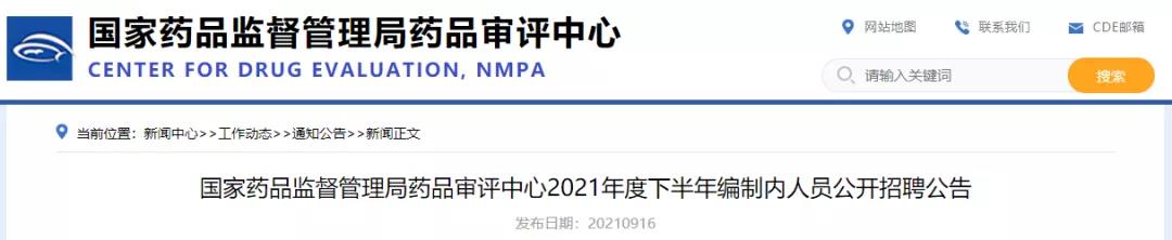 国家药品监督管理局药品审评中心2021年度下半年编制内人员公开招聘公告