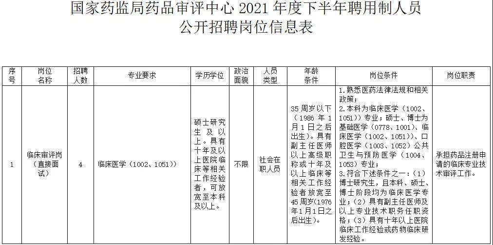 国家药品监督管理局药品审评中心2021年度下半年聘用制人员公开招聘公告