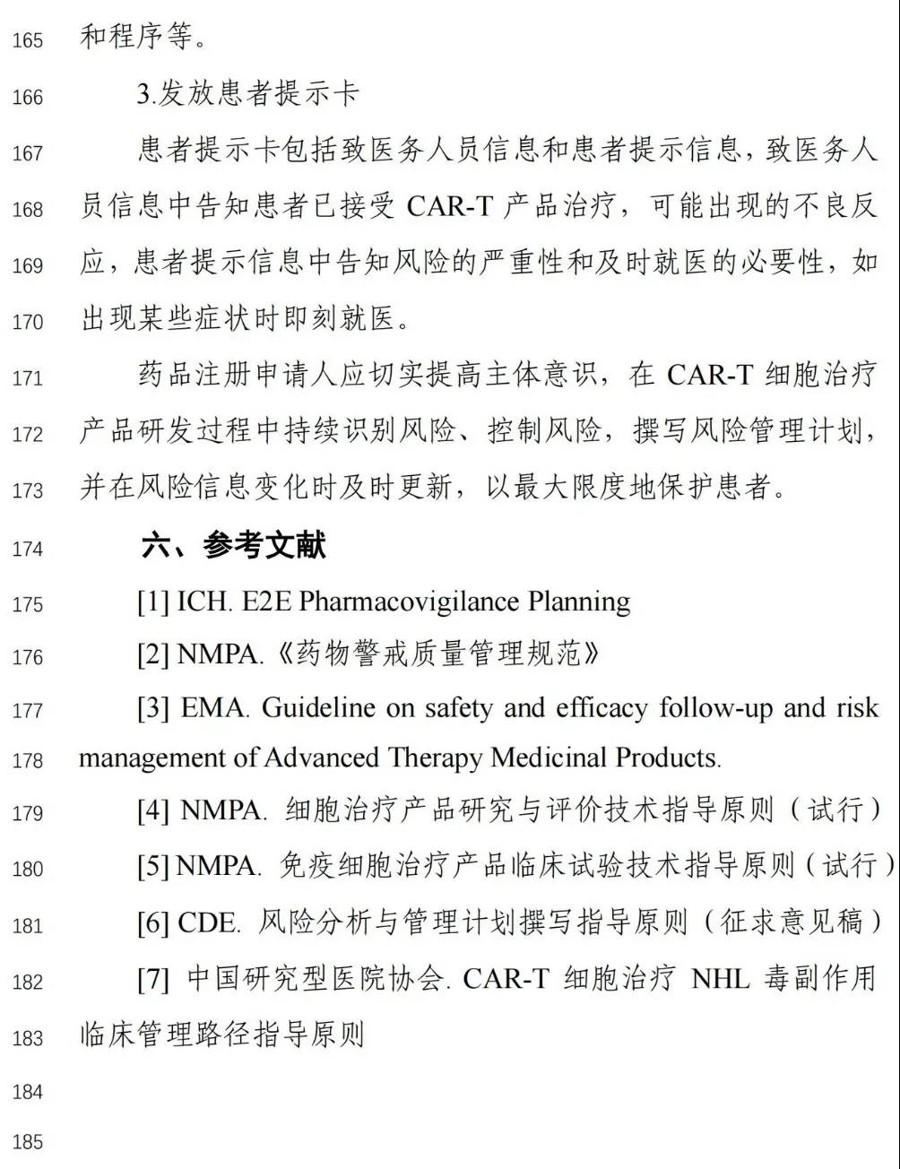 嵌合抗原受体T细胞治疗产品具有新颖性、复杂性和技术特异性的特点,随着此类产品的研发进展和陆续申报上市,为促进企业及早发现此类产品的风险,提供有效地风险最小措施,确保上市后安全性风险可控,有必要对申报上市的临床风险管理计划提出要求和提供指导。我中心在充分调研的基础上起草了《嵌合抗原受体T细胞(CAR-T)产品申报上市临床风险管理计划技术指导原则(征求意见稿)》。