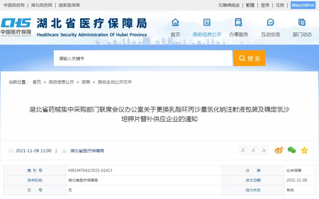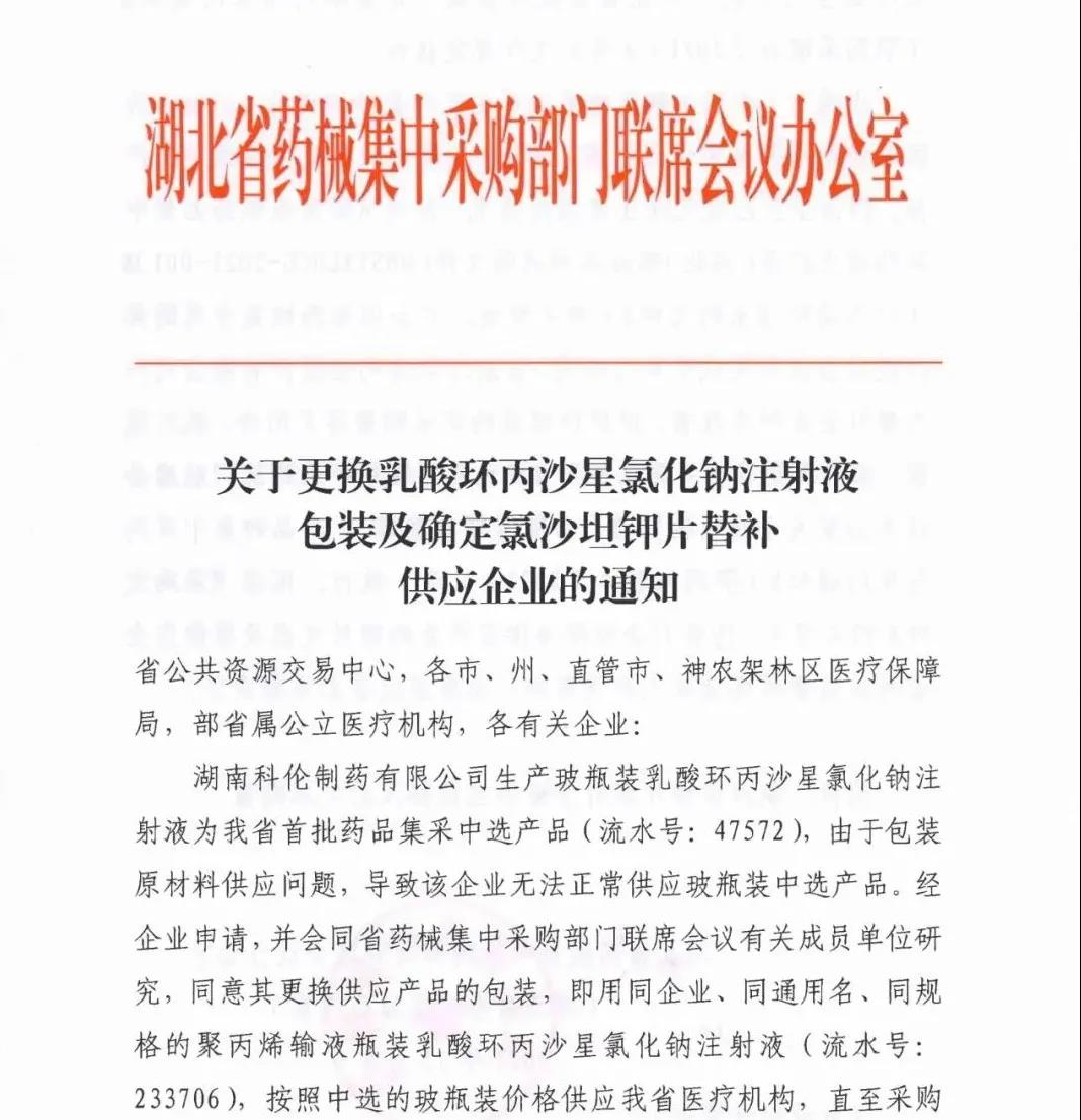 导读:今日,湖北省医疗保障局公布了湖北省药械集中采购部门联席会议办公室关于更换乳酸环丙沙星氯化钠注射液包装及确定氯沙坦钾片替补供应企业的通知。