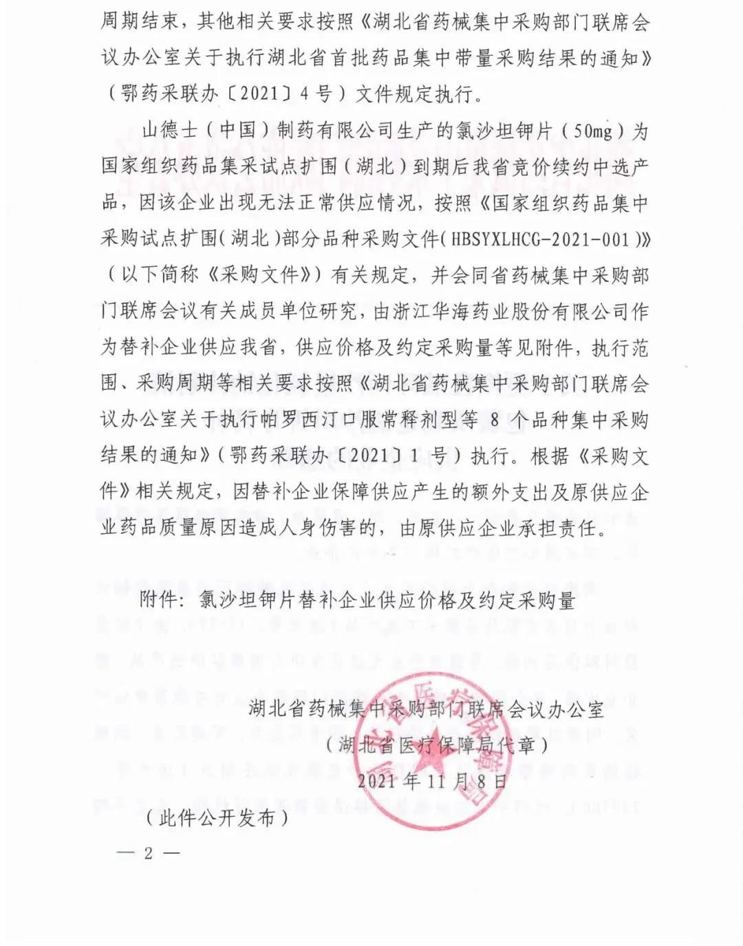 通知中指出,山德士(中国)制药有限公司生产的氯沙坦钾片 (50mg )为国家组织药品集采试点扩围 (湖北 )到期后湖北省竞价续约中选产品,现该企业出现无法正常供应的情况,将由浙江华海药业股份有限公司作为替补企业进行供应,具体供应价格及约定采购量等见附件。