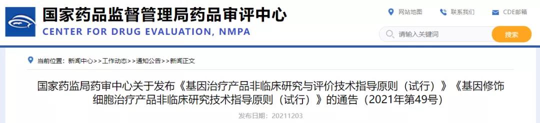 为规范国内基因治疗产品非临床研究与评价,引导行业健康发展,提高企业研发效率,在国家药品监督管理局的部署下,药审中心组织制定了《基因治疗产品非临床研究与评价技术指导原则(试行)》(见附件1)、《基因修饰细胞治疗产品非临床研究技术指导原则(试行)》(见附件2)。根据《国家药监局综合司关于印发药品技术指导原则发布程序的通知》(药监综药管〔2020〕9号)要求,经国家药品监督管理局审查同意,现予发布,自发布之日起施行。