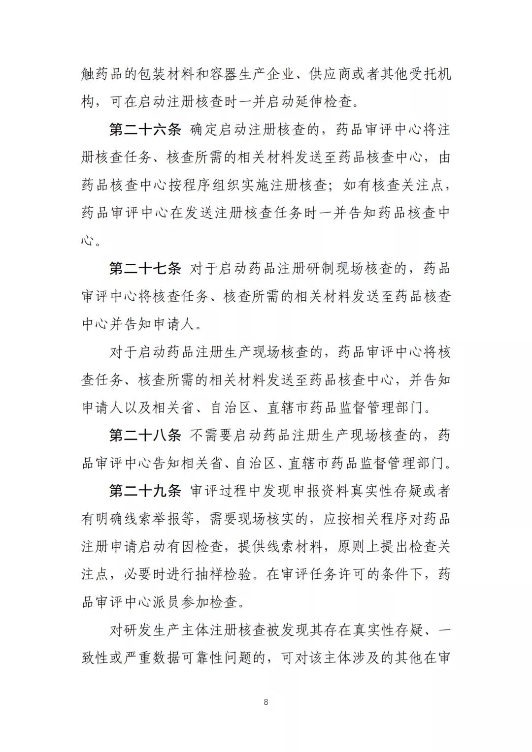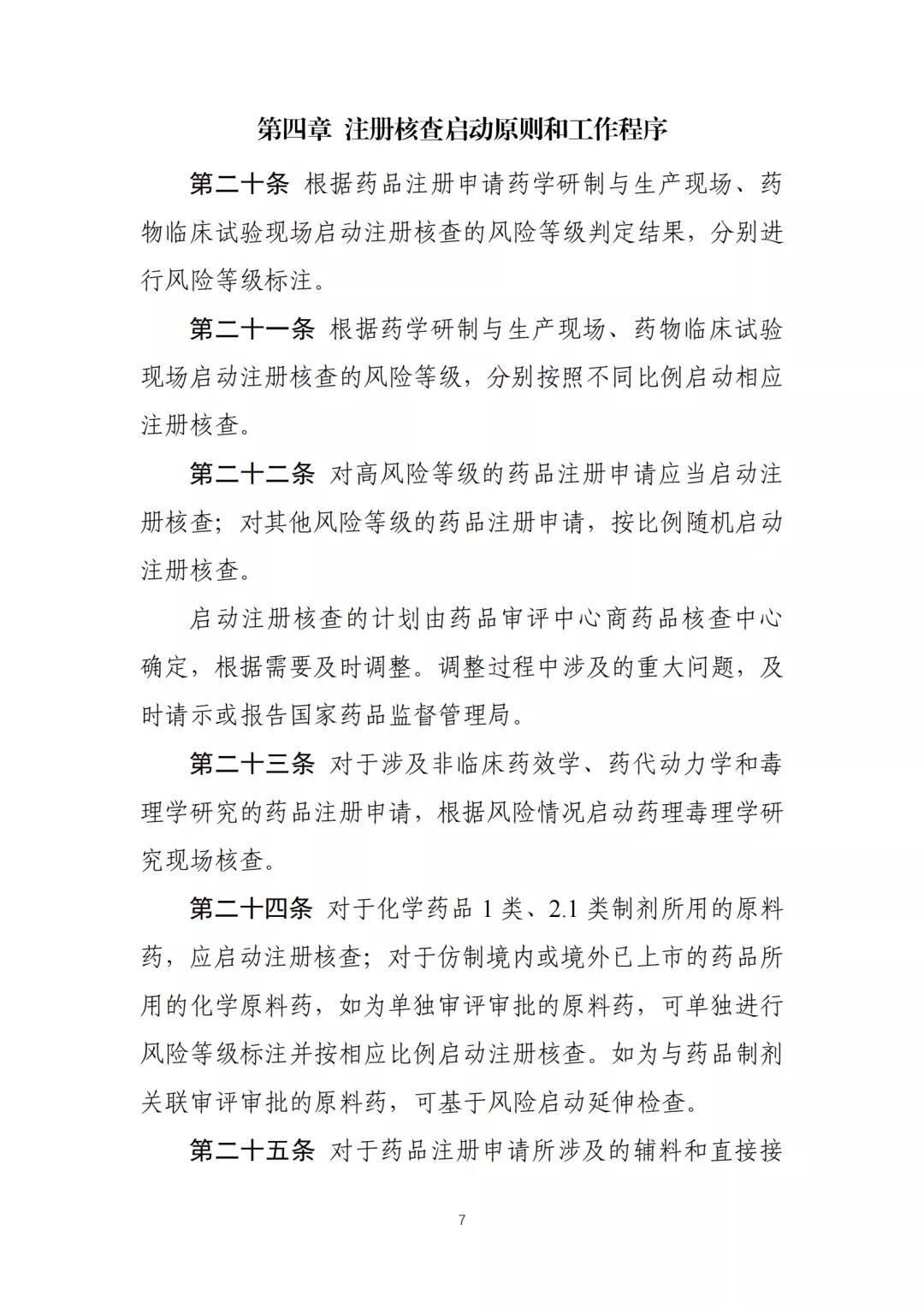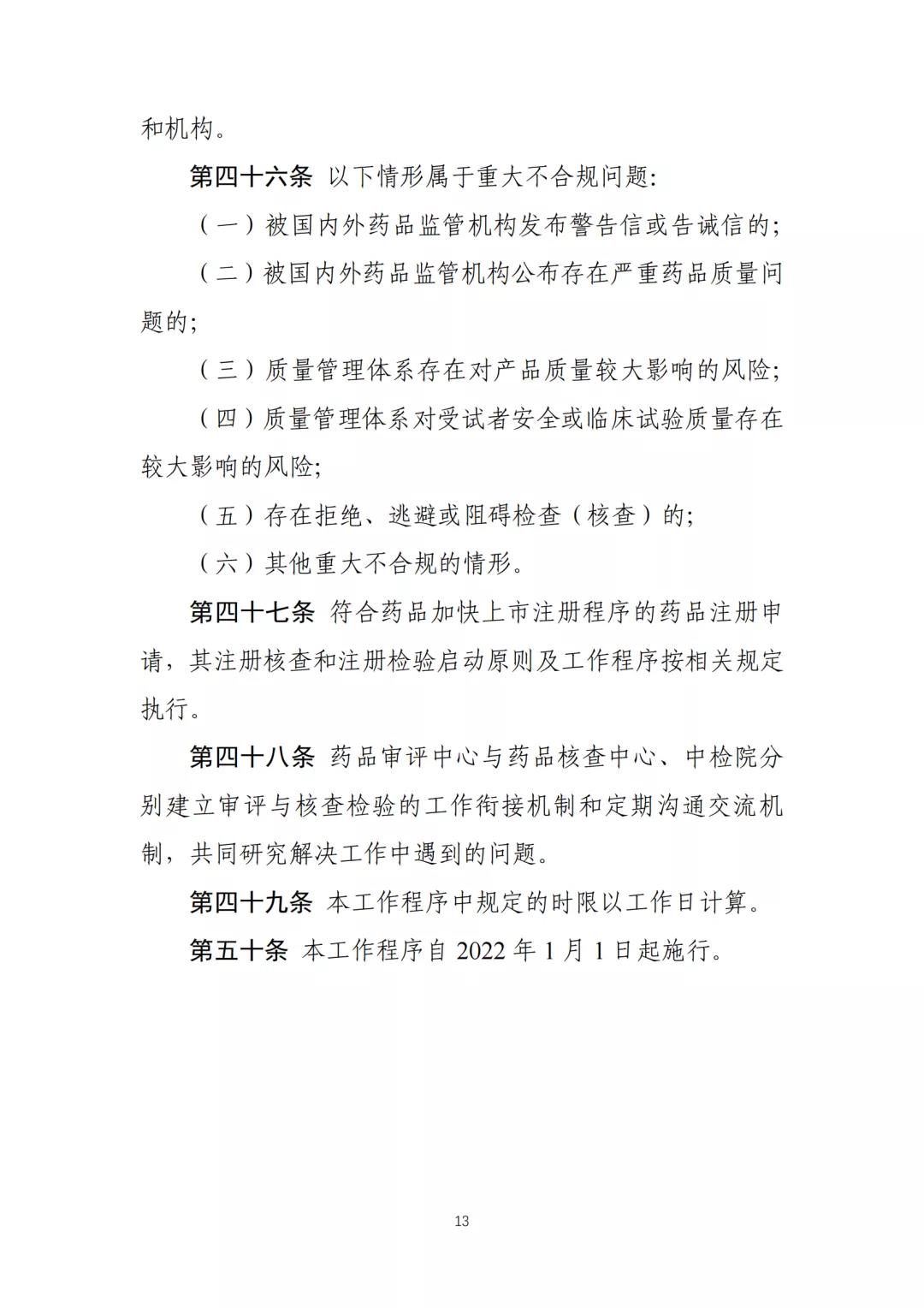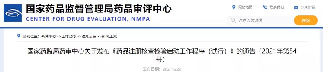 为落实《药品注册管理办法》(国家市场监督管理总局令第27号)相关要求,规范药品注册核查检验启动工作,药审中心组织制定了《药品注册核查检验启动工作程序(试行)》(见附件,以下简称《启动工作程序》),广泛征求了业界以及相关司局、核查中心、中检院等单位意见,经国家药品监督管理局审查同意,现予发布,自2022年1月1日起实施。现就有关事项通告如下: