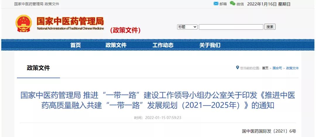2022年1月15日,国家中医药管理局 推进“一带一路”建设工作领导小组办公室印发《推进中医药高质量融入共建“一带一路”发展规划(2021—2025年)》