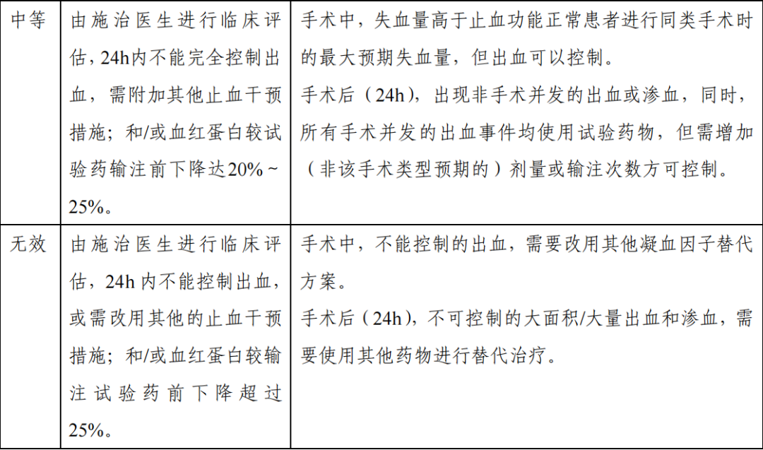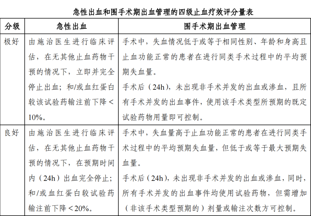 对于围手术期出血管理的临床疗效评价,还可以包括术中和术后24小时失血和输血需求等情况。