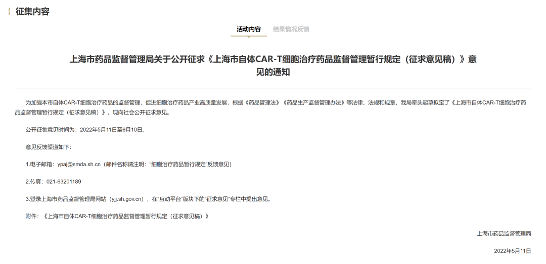 2022年5月11日,上海市药品监督管理局关于公开征求《上海市自体CAR-T细胞治疗药品监督管理暂行规定(征求意见稿)》意见的通知:
