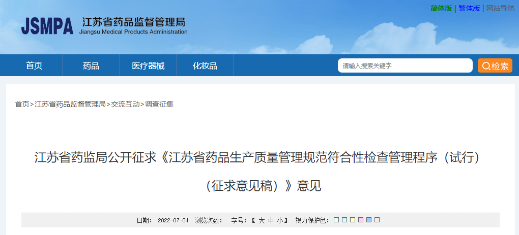 江苏省药监局公开征求《江苏省药品生产质量管理规范符合性检查管理程序(试行)(征求意见稿)》意见,反馈意见截止时间为2022年8月3日。