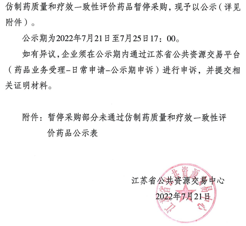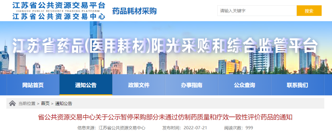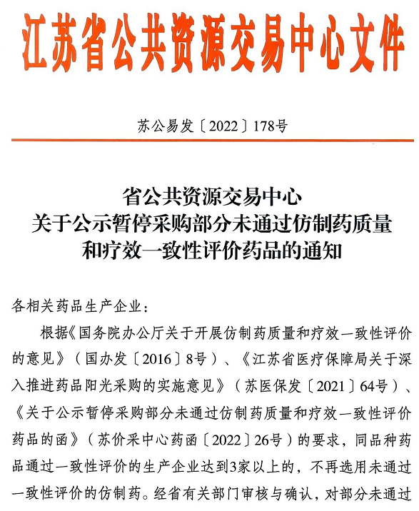 江苏省公共资源交易中心公示暂停采购部分未通过仿制药质量和疗效一致性评价药品,50品规未过评药品被暂停采购!