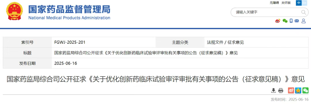 刚刚,国家药监局发布公告,公开征求《关于优化创新药临床试验审评审批有关事项的公告(征求意见稿)》意见。