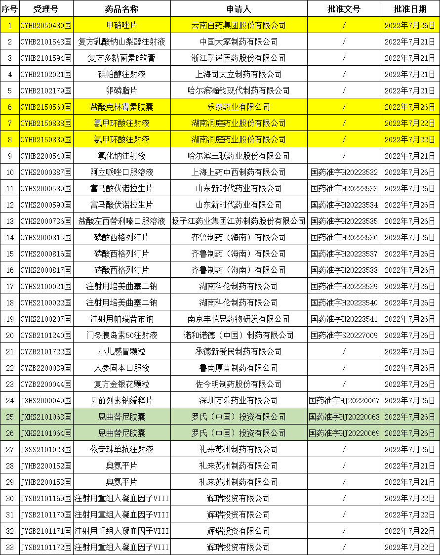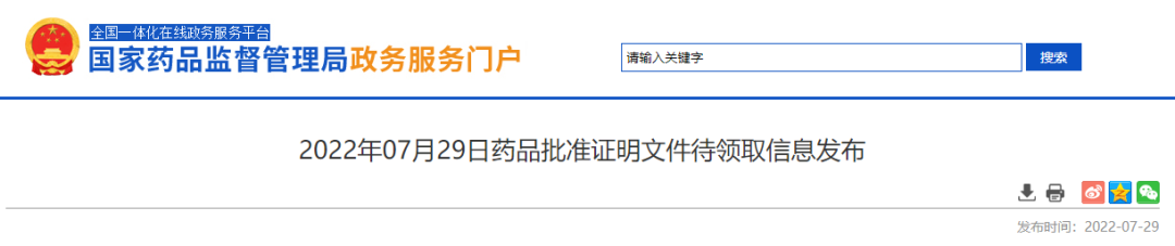 导读:NMPA发布2022年07月29日药品批准证明文件待领取信息,4个一致性评价受理号获批:
