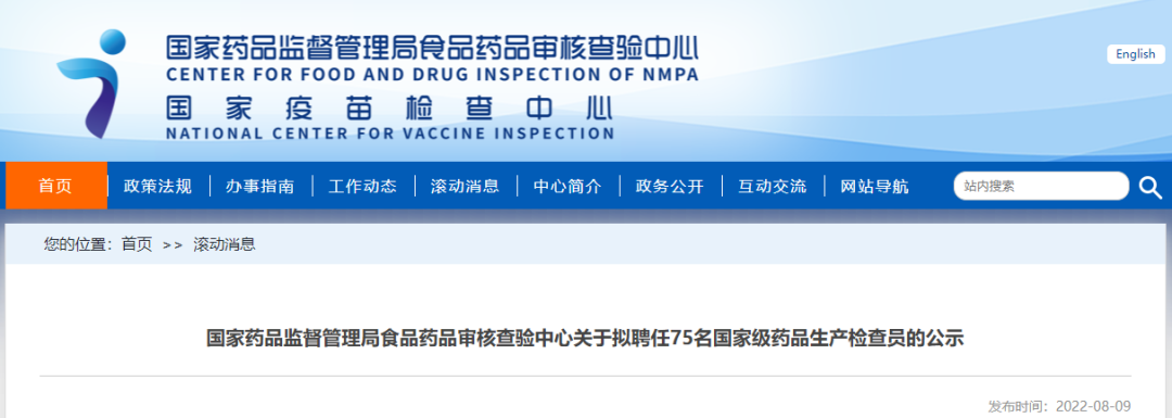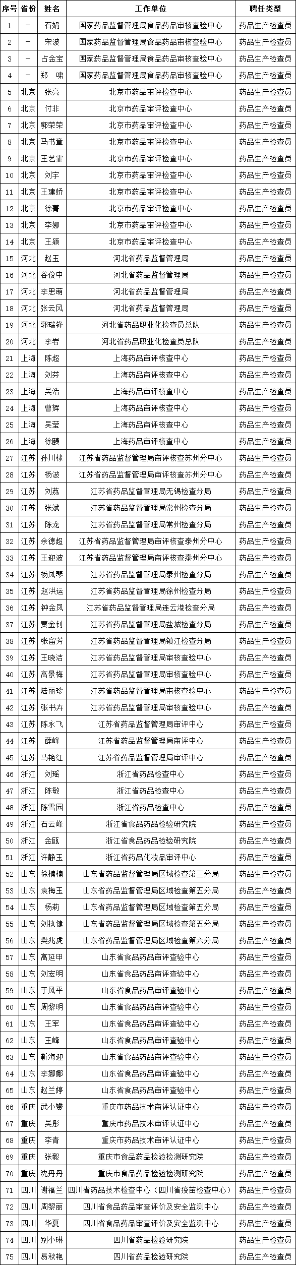 为进一步加强国家级药品检查员队伍建设,保障药品核查检查工作顺利开展,国家药品监督管理局食品药品审核查验中心依据国家药监局《职业化专业化药品检查员分级分类管理办法》及相关程序,拟将75名符合条件的人员(名单见附件)聘任为国家级药品生产检查员。现按程序,予以公示。
