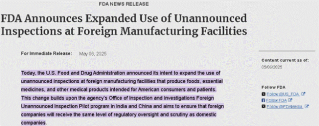 FDA于2025年5月6日宣布,打算扩大对生产供美国消费者和患者使用的基本药物及其他医疗产品的外国生产设施进行不预先通知的检查(突击检查)。FDA此次宣布之前,特朗普于2025年5月5日发布了一项行政命令,旨在减少美国患者用药国内生产的监管障碍,并呼吁加强对海外生产设施基于风险的检查。FDA在公告中指出,扩大对外国进行不预先通知检查的目的,是确保外国制造商受到与国内制造商相同程度的监督和监管审查。