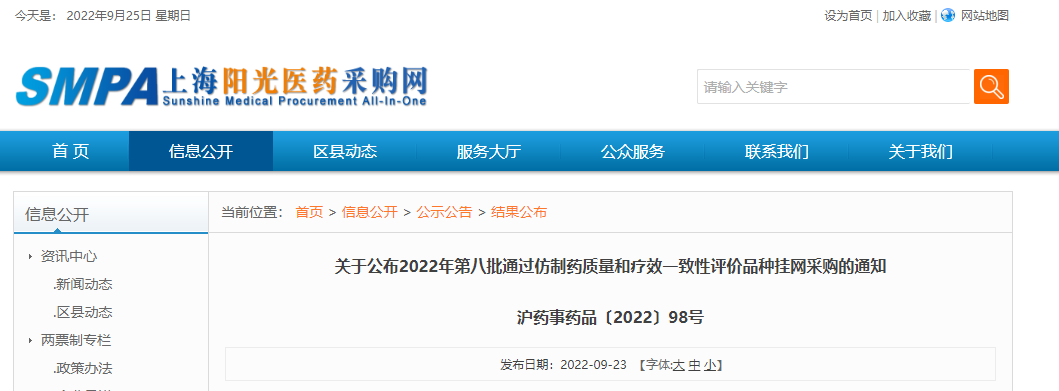 2022年9月23日药品信息将通过“上海市医药采购服务与监管信息系统”(以下简称阳光平台)向医疗机构推送,2022年9月25日生效议价。药品信息公布后,请各药品生产企业核对药品信息,如有疑义及时向市药事所反馈。