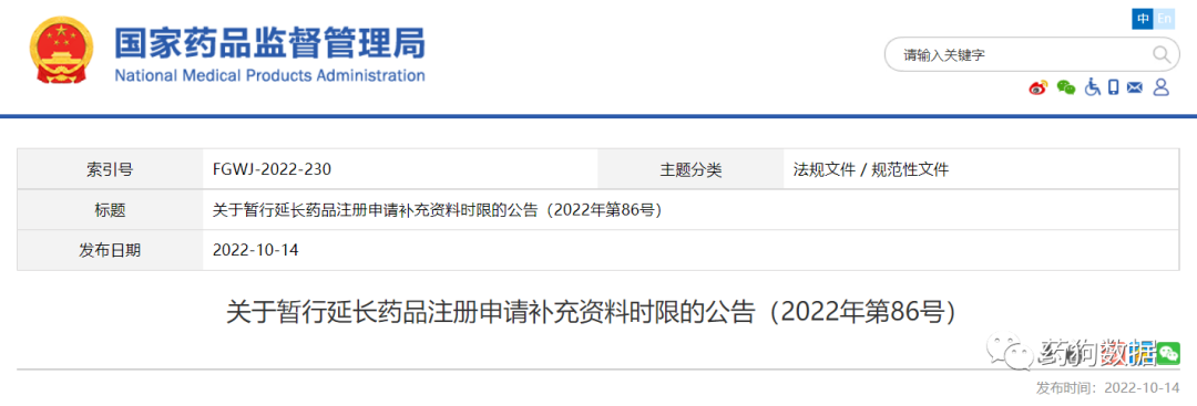 三、 对国家药监局药审中心自本公告发布之日起至2022年12月31日期间出具《补充资料通知书》的药品注册申请,补充资料时限延长为160个工作日。