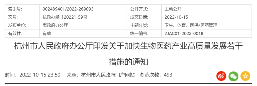 10月15日,杭州市人民政府办公厅发布《关于加快生物医药产业高质量发展的若干措施》,重点支持药品、高端医疗器械、先进制药装备、新型服务外包、数字化医疗及医美等领域的研发、生产和服务,自2022年11月15日起施行,有效期至2027年12月31日。