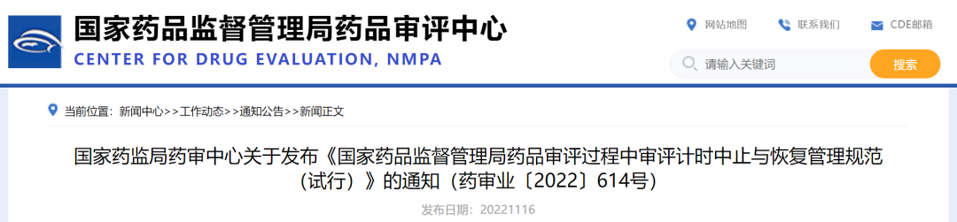 为规范审评过程中审评计时中止和恢复管理,CDE最新发布《国家药品监督管理局药品审评过程中审评计时中止与恢复管理规范(试行)》,自发布之日起实施。