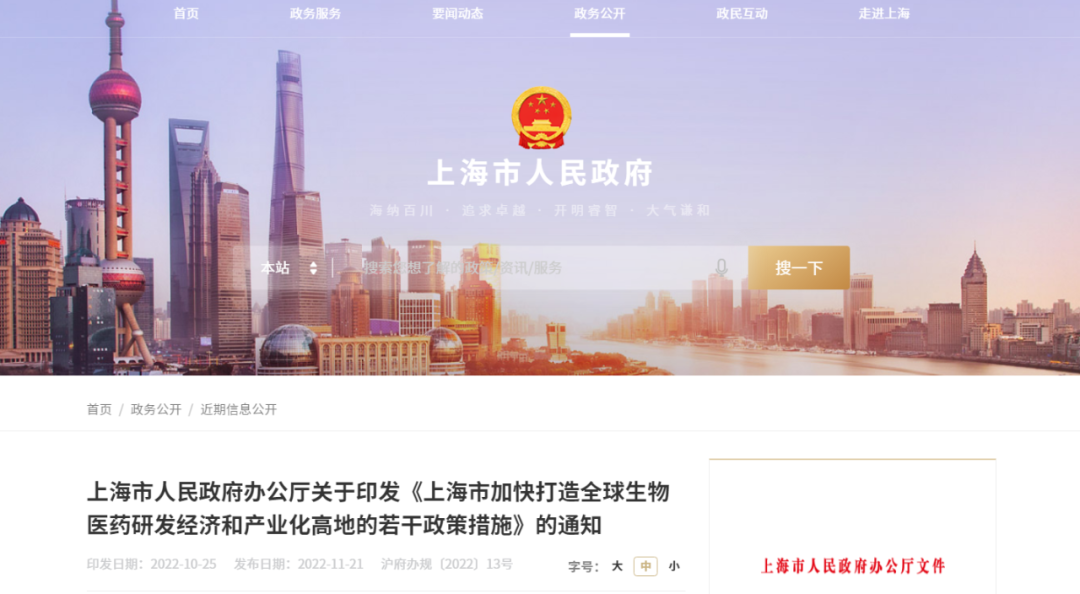 11月21日,上海市人民政府办公厅发布关于印发《上海市加快打造全球生物医药研发经济和产业化高地的若干政策措施》的通知,《措施》内容包括6个方面共16条。
