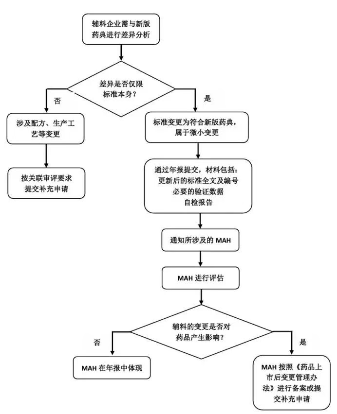 药用辅料企业为符合2025年版《中国药典》要求而进行的药用辅料标准变更,仅涉及变更药用辅料标准且该标准满足《中国药典》要求的,可将更新的药用辅料标准在年报中体现,年报中应包括更新后的标准全文和标准编号,以及必要的验证数据和自检报告等,及时通知相关药品上市许可持有人。药品上市许可持有人应及时就相应变更对药品制剂质量的影响情况进行评估或研究,并按照《关于实施2025年版〈中华人民共和国药典〉有关事宜的公告》和关联审评的有关要求执行。”