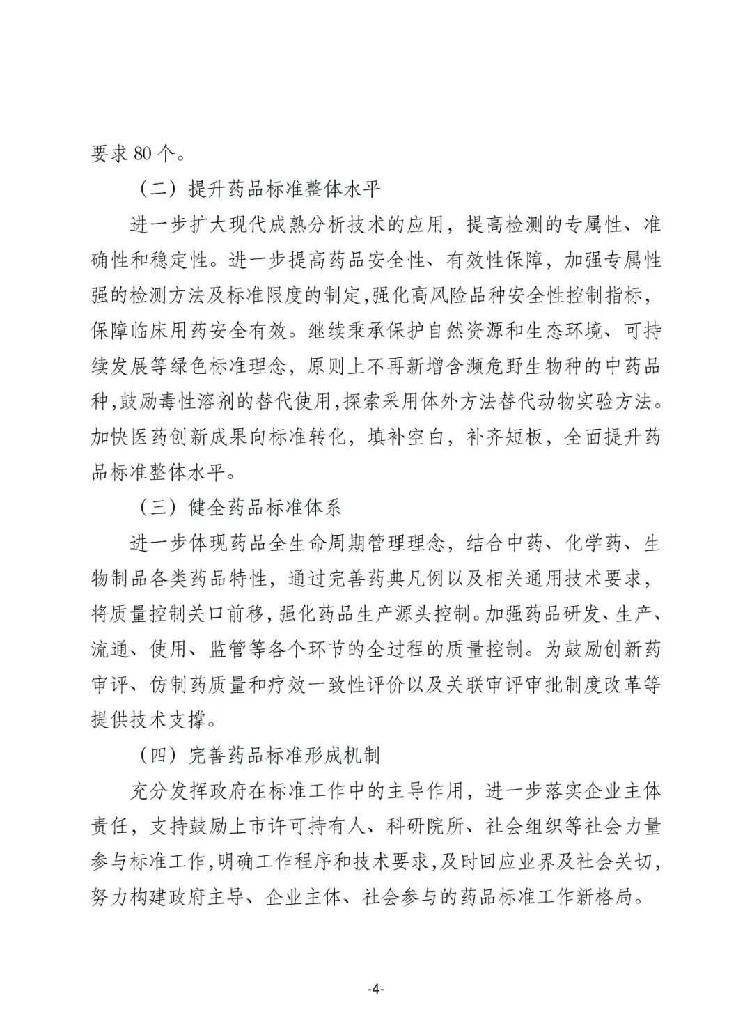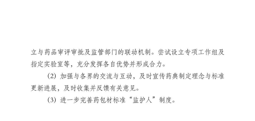 (四) 完善药品标准形成机制,进一步落实企业主体责任,支持鼓励上市许可持有人、科研院所、社会组织等社会力量参与标准工作,明确工作程序和技术要求。