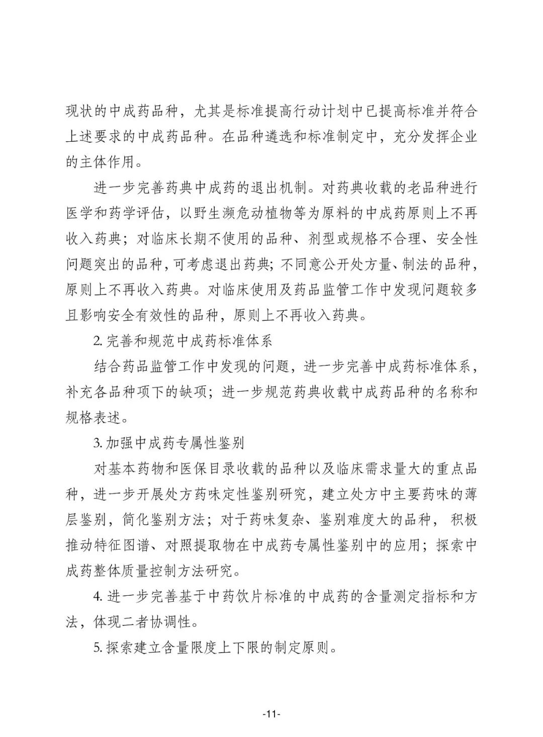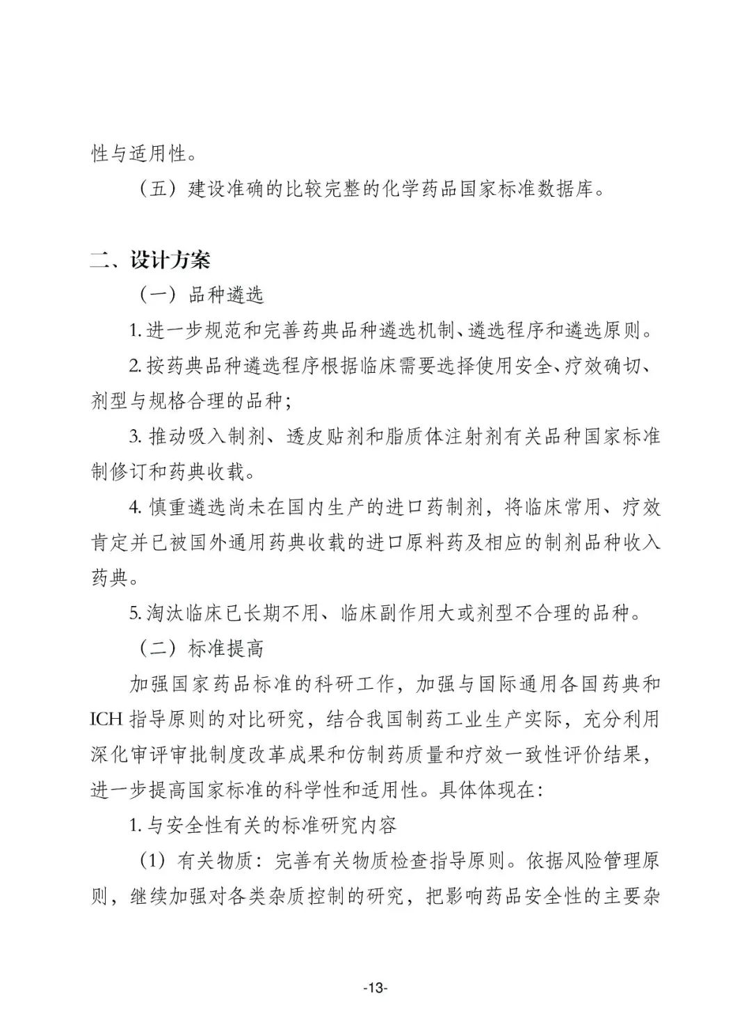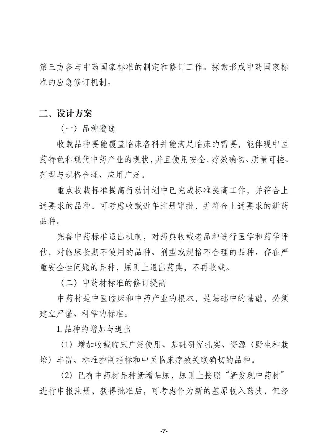 (一) 适度增加药典品种收载范围,坚持临床常用、疗效确切、使用安全、工艺成熟、质量可控的原则,结合国家基本药物目录和国家基本医疗保险用药目录调整情况,继续扩大目录品种覆盖率,及时纳入创新药品。