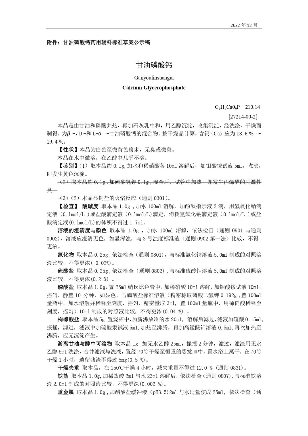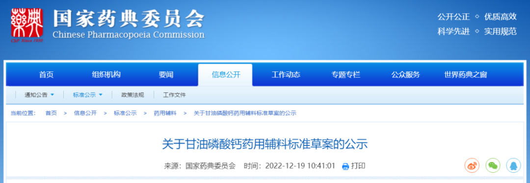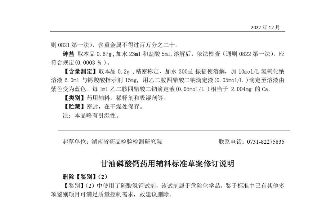 我委拟修订甘油磷酸钙药用辅料标准,为确保标准的科学性、合理性和适用性,现将拟修订的药用辅料标准公示征求社会各界意见(详见附件)。公示期自发布之日起3个月。请认真研核,若有异议,请及时来函提交反馈意见,并附相关说明、实验数据和联系方式。相关单位来函需加盖公章,个人来函需本人签名,同时将电子版发送至指定邮箱。