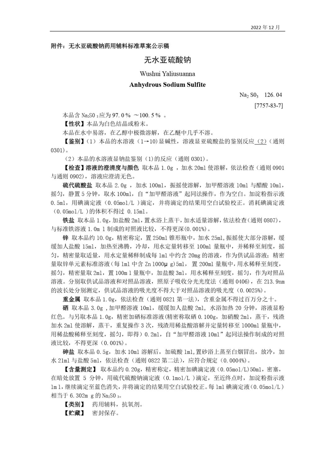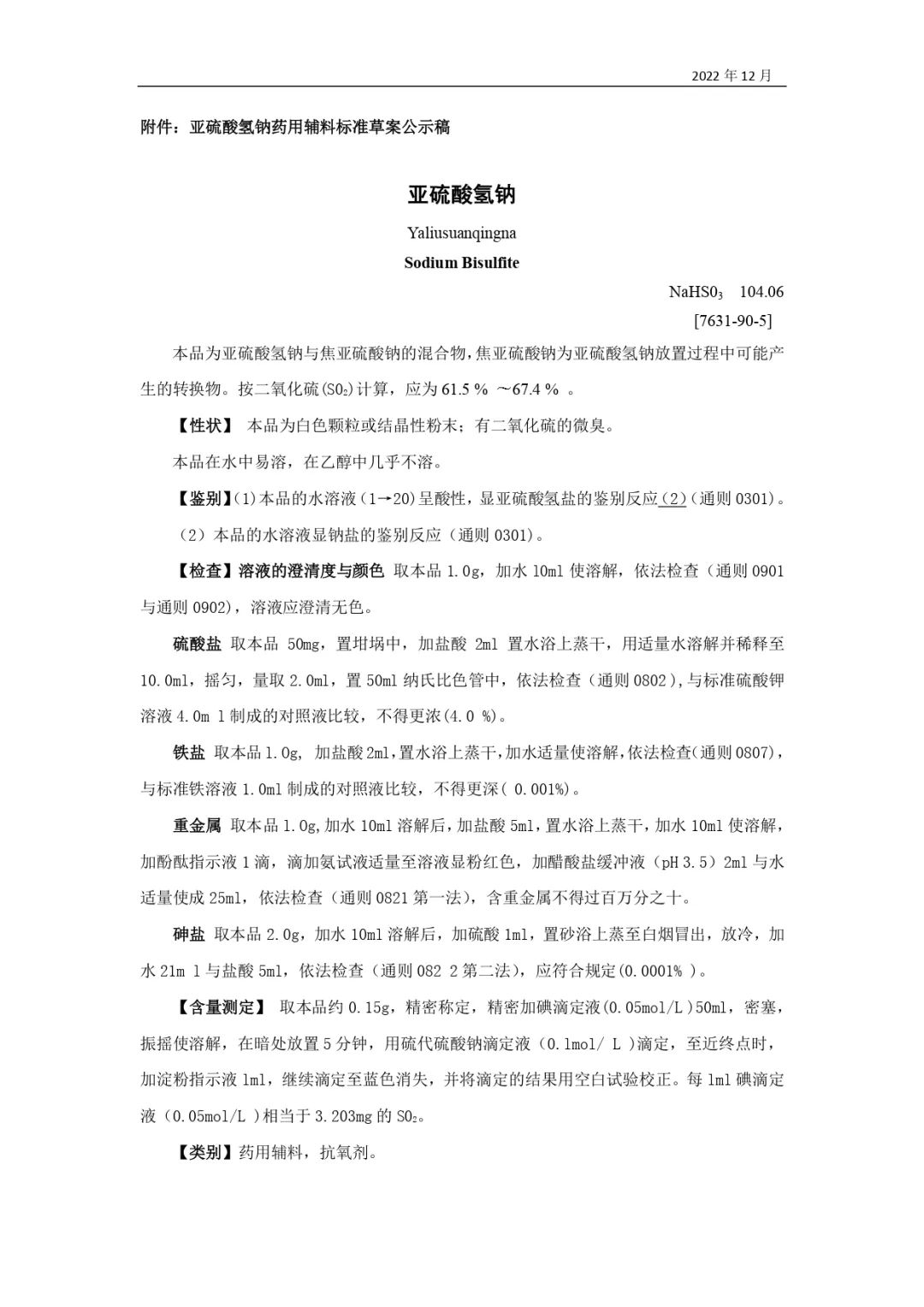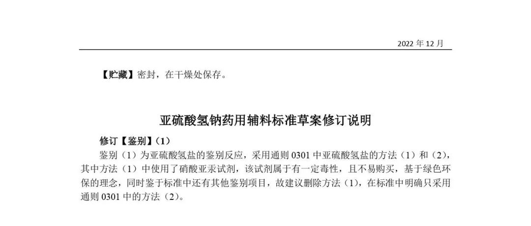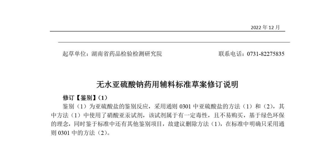 我委拟制修订亚硫酸氢钠药用辅料标准,为确保标准的科学性、合理性和适用性,现将拟修订的药用辅料标准公示征求社会各界意见(详见附件)。公示期自发布之日起3个月。请认真研核,若有异议,请及时来函提交反馈意见,并附相关说明、实验数据和联系方式。相关单位来函需加盖公章,个人来函需本人签名,同时将电子版发送至指定邮箱。