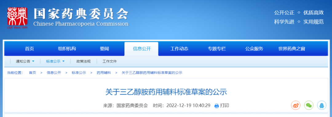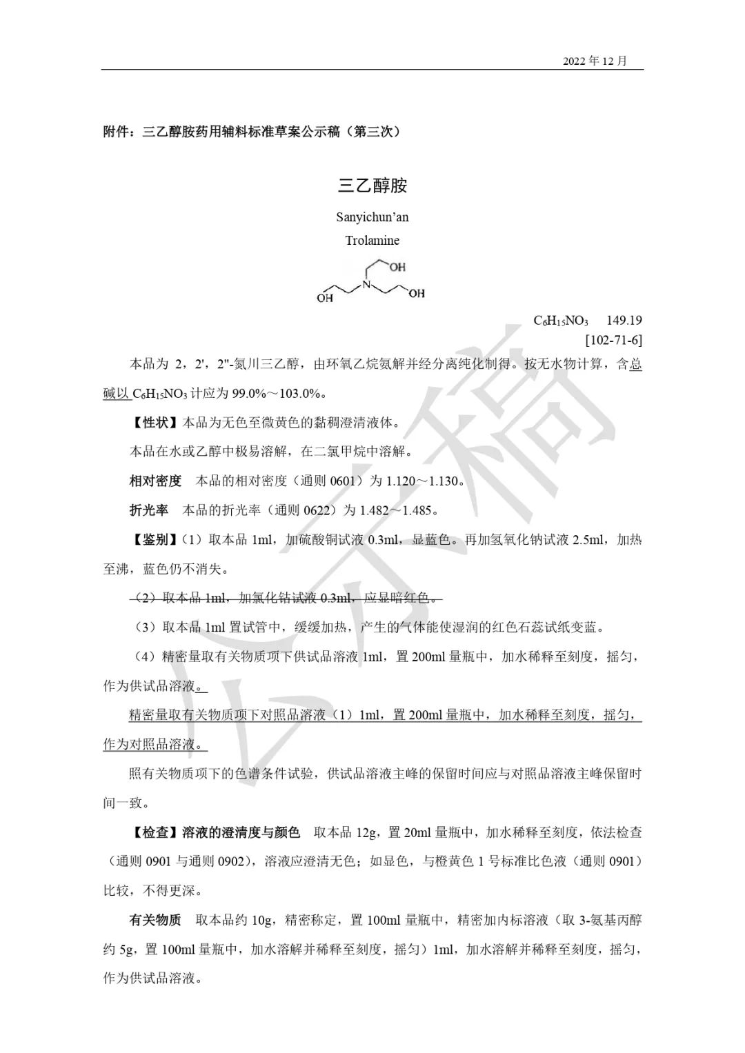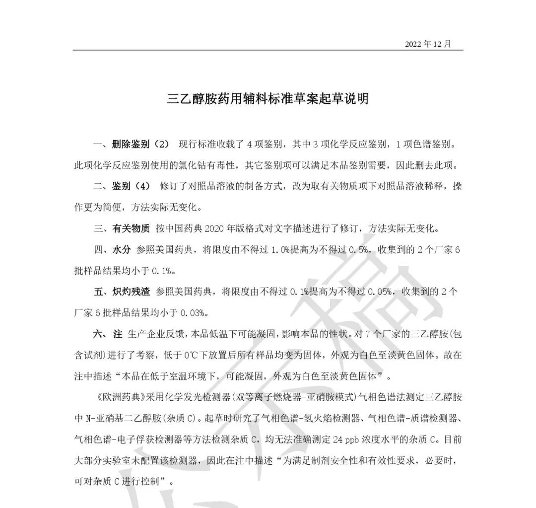 我委拟修订三乙醇胺药用辅料标准,为确保标准的科学性、合理性和适用性,现将拟修订的药用辅料标准公示征求社会各界意见(详见附件)。公示期自发布之日起3个月。请认真研核,若有异议,请及时来函提交反馈意见,并附相关说明、实验数据和联系方式。相关单位来函需加盖公章,个人来函需本人签名,同时将电子版发送至指定邮箱。