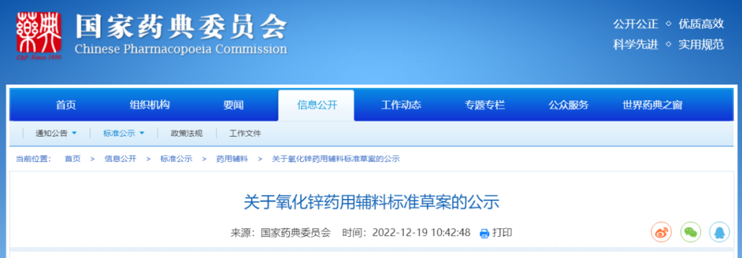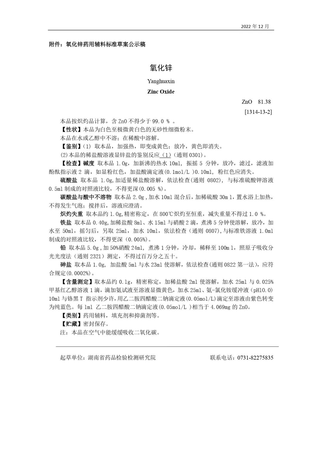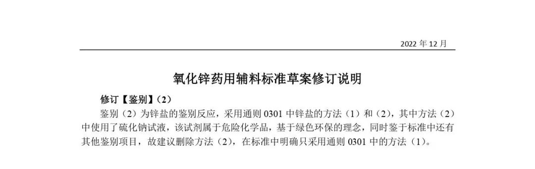 我委拟修订氧化锌药用辅料标准,为确保标准的科学性、合理性和适用性,现将拟制修订的药用辅料标准公示征求社会各界意见(详见附件)。公示期自发布之日起3个月。请认真研核,若有异议,请及时来函提交反馈意见,并附相关说明、实验数据和联系方式。相关单位来函需加盖公章,个人来函需本人签名,同时将电子版发送至指定邮箱。