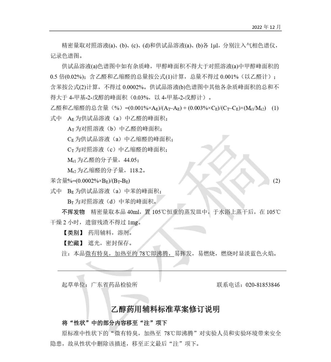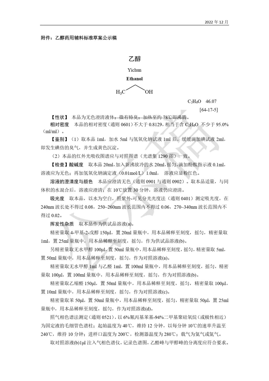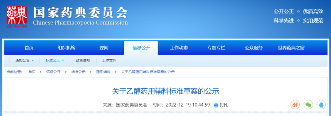 我委拟修订乙醇药用辅料标准,为确保标准的科学性、合理性和适用性,现将拟修订的药用辅料标准公示征求社会各界意见(详见附件)。公示期自发布之日起3个月。请认真研核,若有异议,请及时来函提交反馈意见,并附相关说明、实验数据和联系方式。相关单位来函需加盖公章,个人来函需本人签名,同时将电子版发送至指定邮箱。