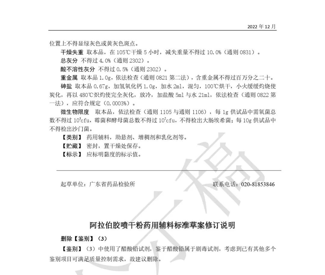我委拟修订阿拉伯胶喷干粉药用辅料标准,为确保标准的科学性、合理性和适用性,现将拟修订的药用辅料标准公示征求社会各界意见(详见附件)。公示期自发布之日起3个月。请认真研核,若有异议,请及时来函提交反馈意见,并附相关说明、实验数据和联系方式。相关单位来函需加盖公章,个人来函需本人签名,同时将电子版发送至指定邮箱。