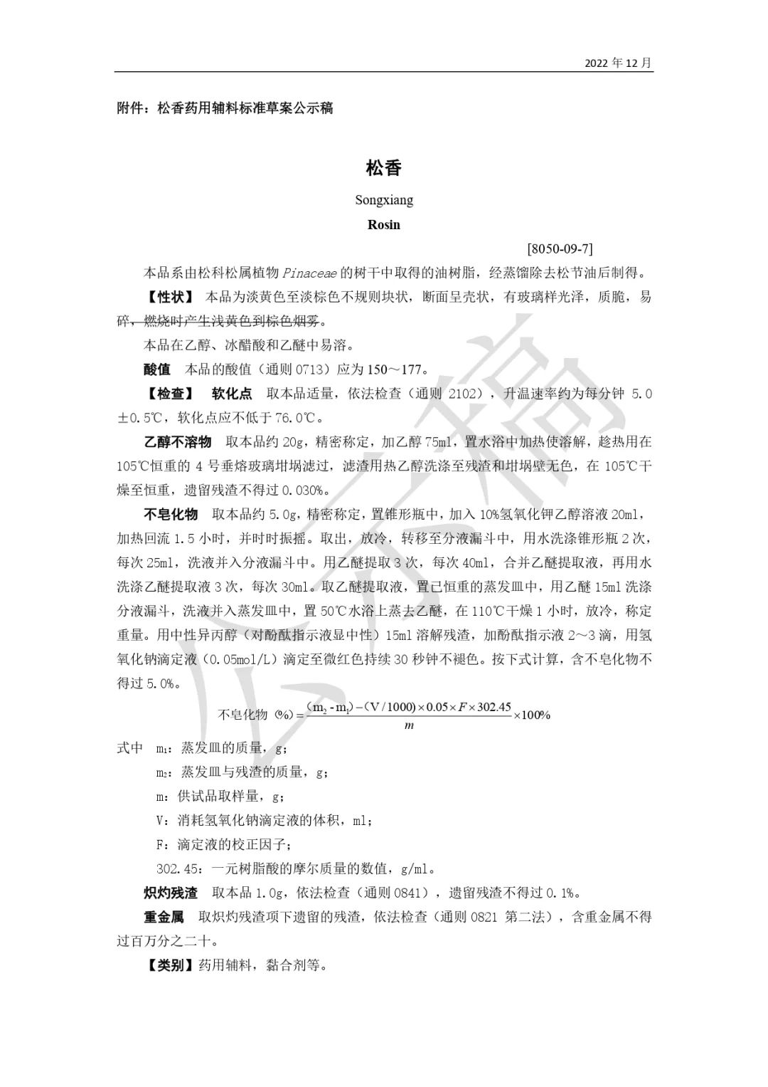 我委拟修订松香药用辅料标准,为确保标准的科学性、合理性和适用性,现将拟修订的药用辅料标准公示征求社会各界意见(详见附件)。公示期自发布之日起3个月。请认真研核,若有异议,请及时来函提交反馈意见,并附相关说明、实验数据和联系方式。相关单位来函需加盖公章,个人来函需本人签名,同时将电子版发送至指定邮箱。