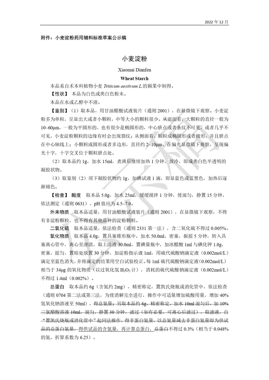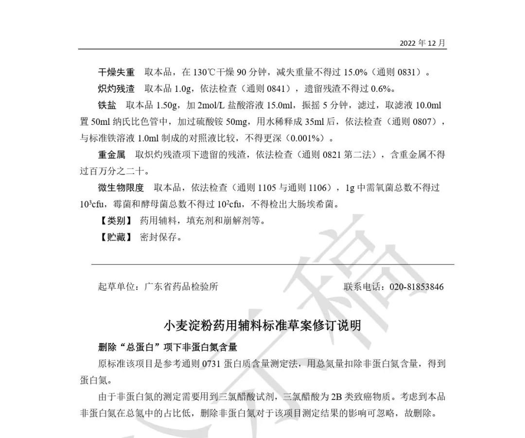 我委拟修订小麦淀粉药用辅料标准,为确保标准的科学性、合理性和适用性,现将拟制定(修订)的药用辅料标准公示征求社会各界意见(详见附件)。公示期自发布之日起3个月。请认真研核,若有异议,请及时来函提交反馈意见,并附相关说明、实验数据和联系方式。相关单位来函需加盖公章,个人来函需本人签名,同时将电子版发送至指定邮箱。