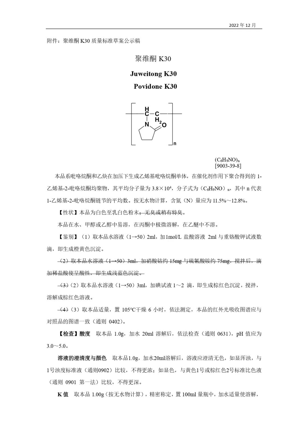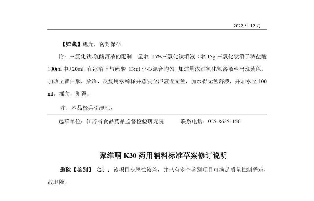 我委拟修订聚维酮K30药用辅料标准,为确保标准的科学性、合理性和适用性,现将拟修订的药用辅料标准公示征求社会各界意见(详见附件)。公示期自发布之日起3个月。请认真研核,若有异议,请及时来函提交反馈意见,并附相关说明、实验数据和联系方式。相关单位来函需加盖公章,个人来函需本人签名,同时将电子版发送至指定邮箱。