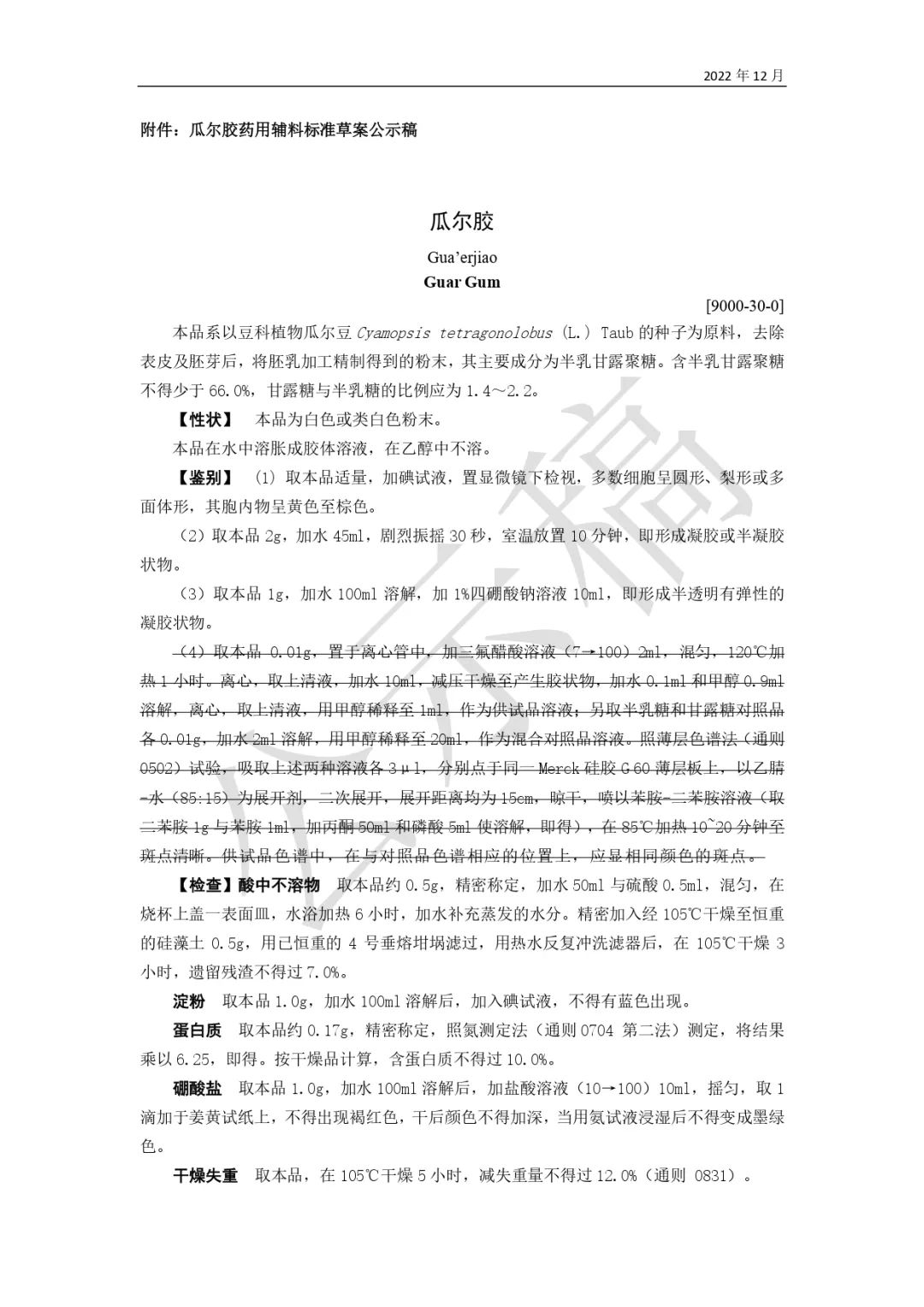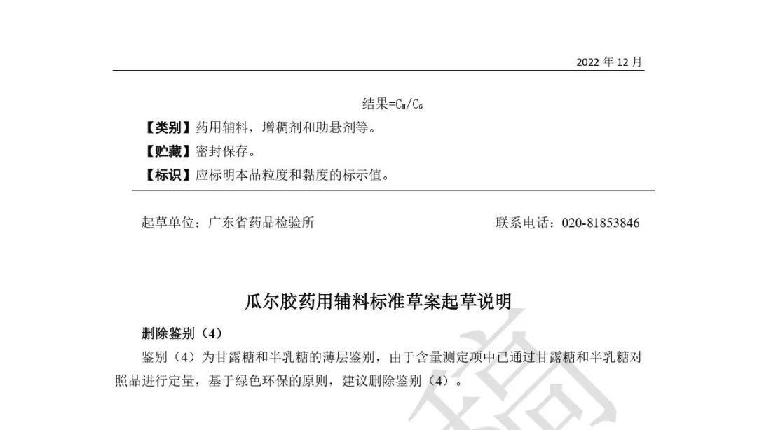 我委拟修订瓜尔胶药用辅料标准,为确保标准的科学性、合理性和适用性,现将拟修订的药用辅料标准公示征求社会各界意见(详见附件)。公示期自发布之日起3个月。请认真研核,若有异议,请及时来函提交反馈意见,并附相关说明、实验数据和联系方式。相关单位来函需加盖公章,个人来函需本人签名,同时将电子版发送至指定邮箱。