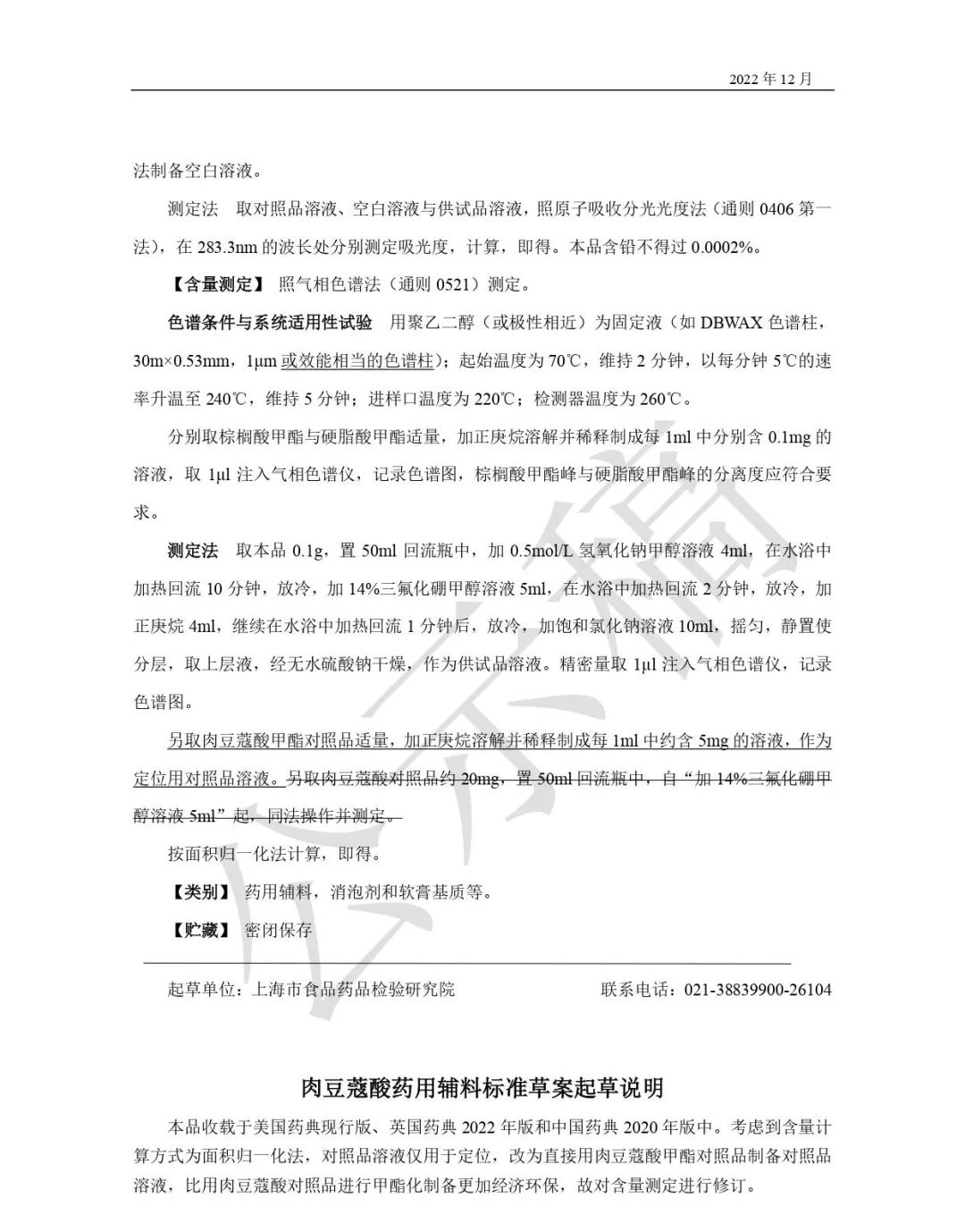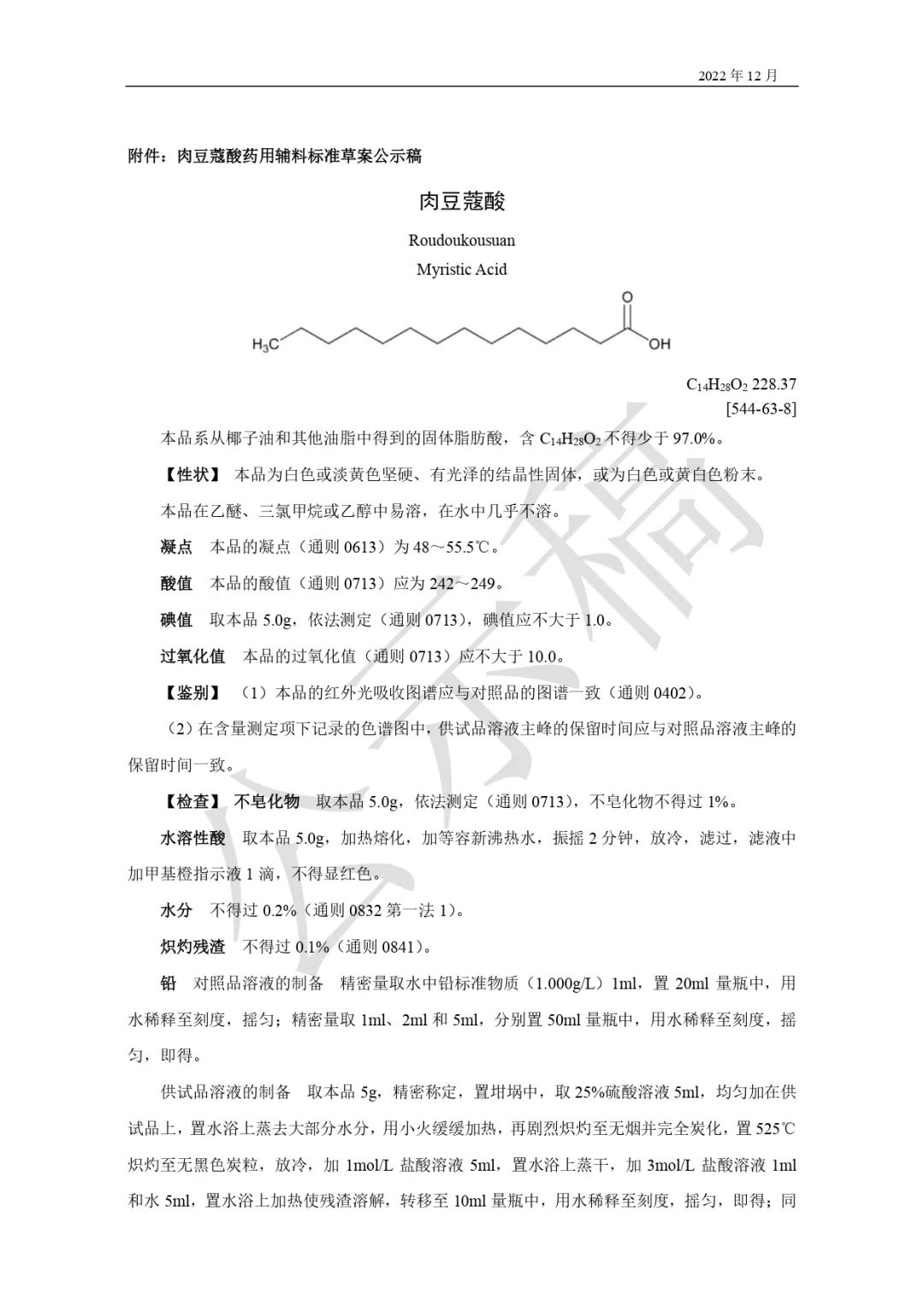 我委拟修订肉豆蔻酸药用辅料标准,为确保标准的科学性、合理性和适用性,现将拟修订的药用辅料标准公示征求社会各界意见(详见附件)。公示期自发布之日起3个月。请认真研核,若有异议,请及时来函提交反馈意见,并附相关说明、实验数据和联系方式。相关单位来函需加盖公章,个人来函需本人签名,同时将电子版发送至指定邮箱。