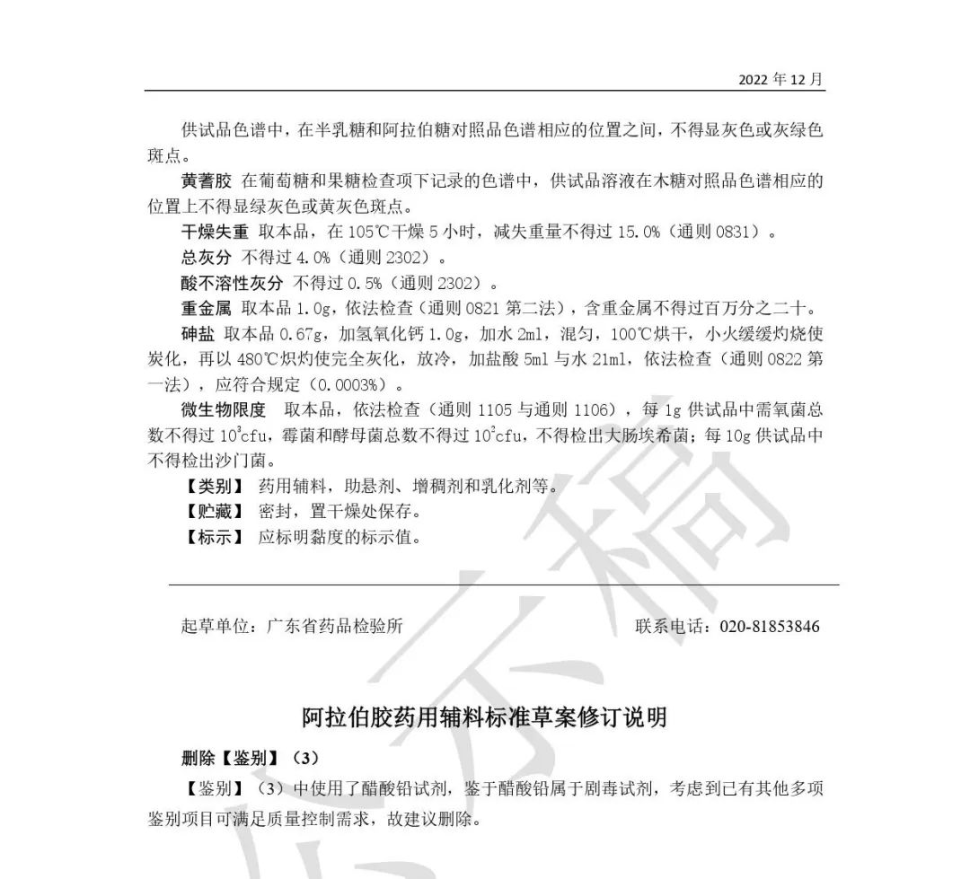 我委拟修订阿拉伯胶药用辅料标准,为确保标准的科学性、合理性和适用性,现将拟制定(修订)的药用辅料标准公示征求社会各界意见(详见附件)。公示期自发布之日起3个月。请认真研核,若有异议,请及时来函提交反馈意见,并附相关说明、实验数据和联系方式。相关单位来函需加盖公章,个人来函需本人签名,同时将电子版发送至指定邮箱。