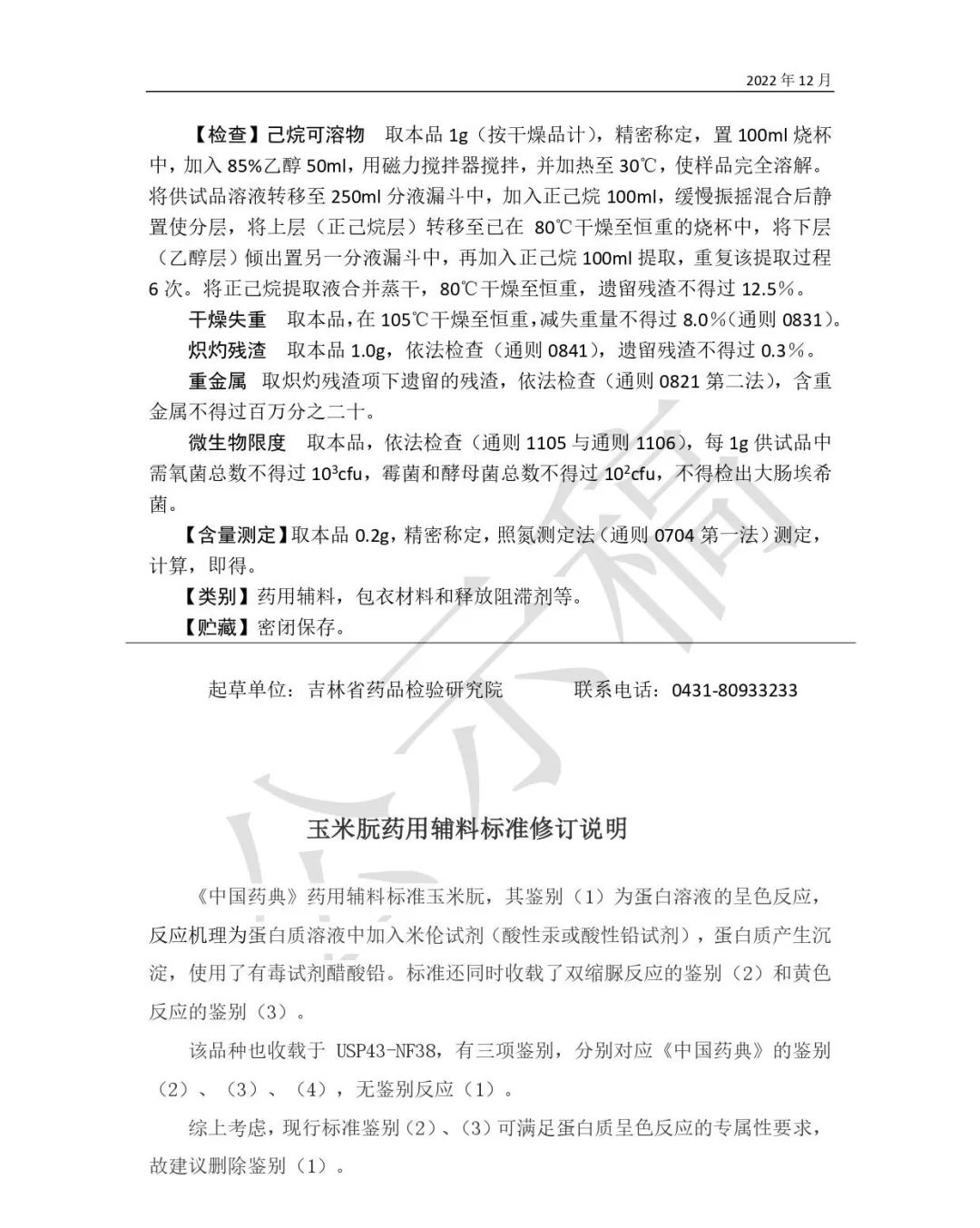 我委拟修订玉米朊药用辅料标准,为确保标准的科学性、合理性和适用性,现将拟修订标准公示征求社会各界意见(详见附件)。公示期自发布之日起3个月。请认真研核,若有异议,请及时来函提交反馈意见,并附相关说明、实验数据和联系方式。相关单位来函需加盖公章,个人来函需本人签名,同时将电子版发送至指定邮箱。
