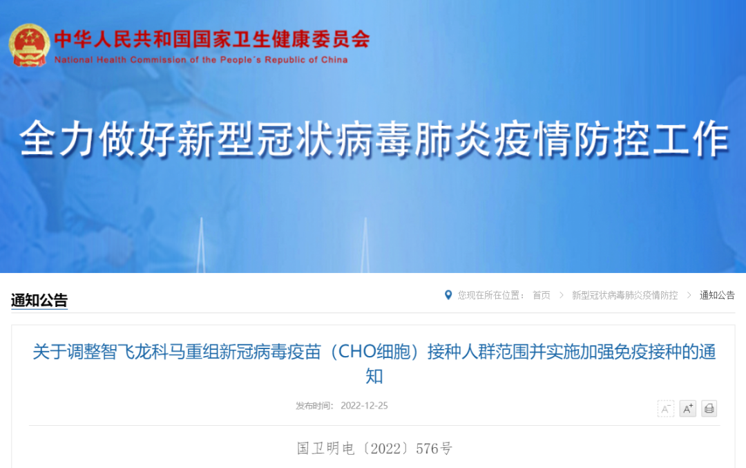 为进一步做好新冠病毒疫苗接种工作,结合疫苗研发进展和专家研究论证情况,现将智飞龙科马重组新冠病毒疫苗(CHO细胞)接种人群范围调整及其第一剂次加强免疫接种安排通知如下。